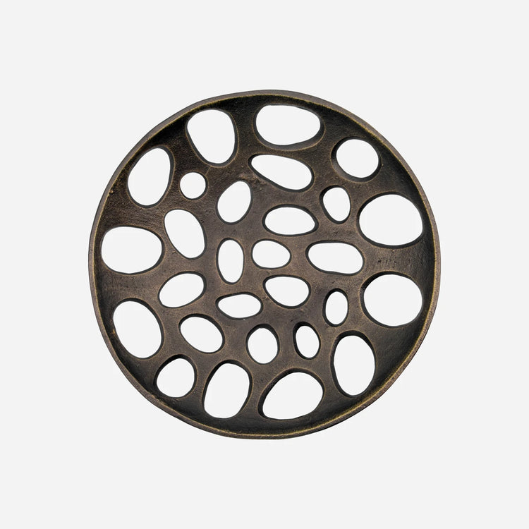 Med dette smukke kunstværk i støbt aluminium kan du tilføje et strejf af sofistikation og kunstnerisk flair til din boligindretning. Den antikke sorte finish og det unikke åbne mønster gør det til et blikfang, der kan stå på et bord eller hænge på væggen.- Håndlavet håndværk- Alsidige placeringsmuligheder- Antik sort finish- Unikt åbent mønsterGiv dit rum et løft med dette udsøgte dekorative tilbehør.