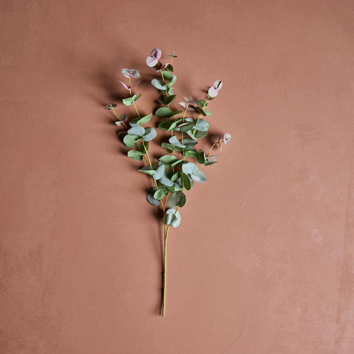 Kunstig stilk med matgrønne blade og et diskret rosa skær, der giver et naturtro udtryk. Stil den alene i en vase for et enkelt look, eller kombiner den med andre grene.
