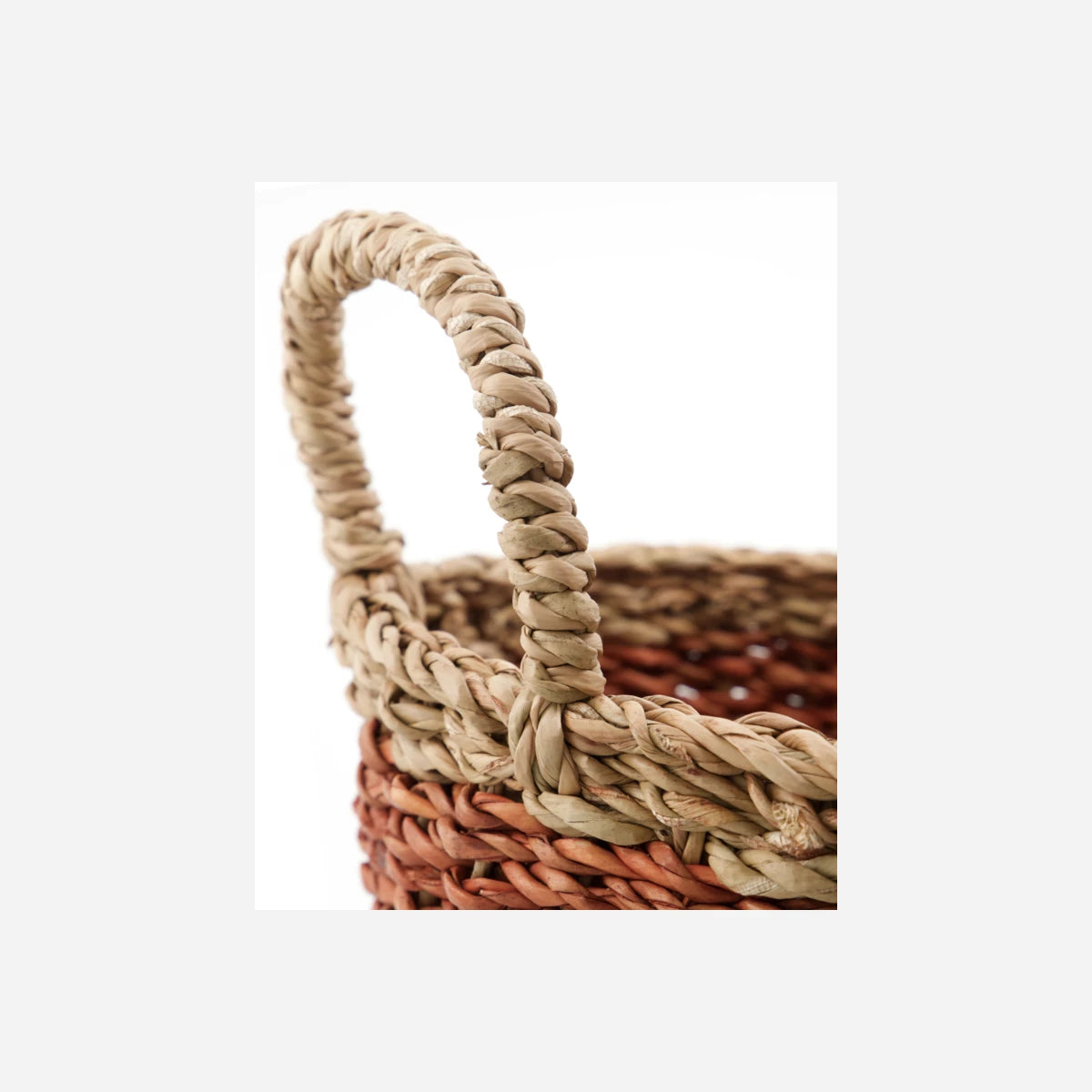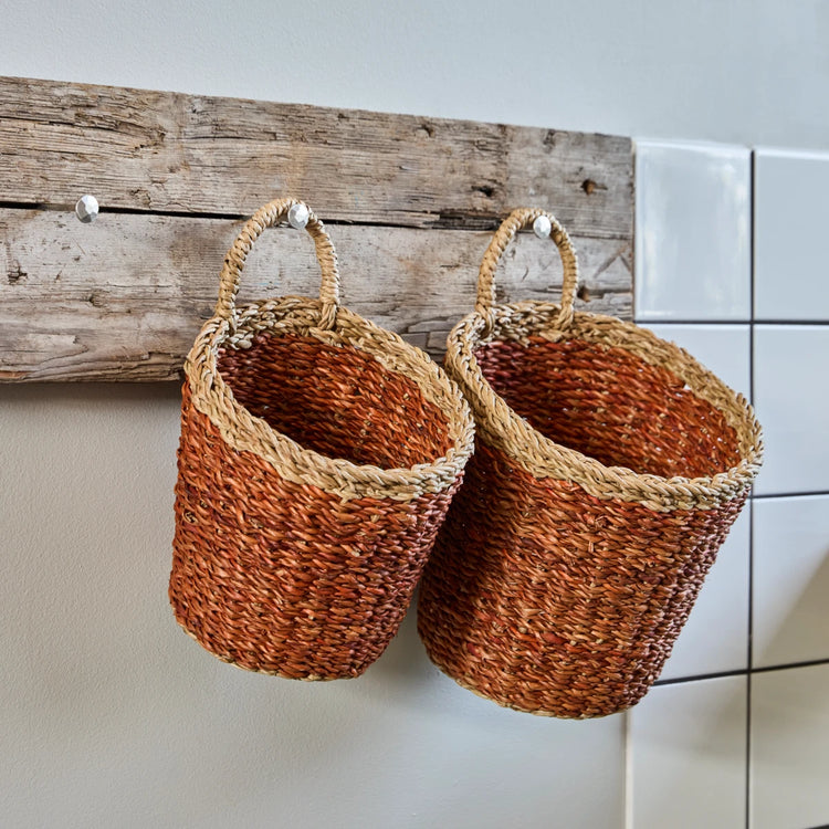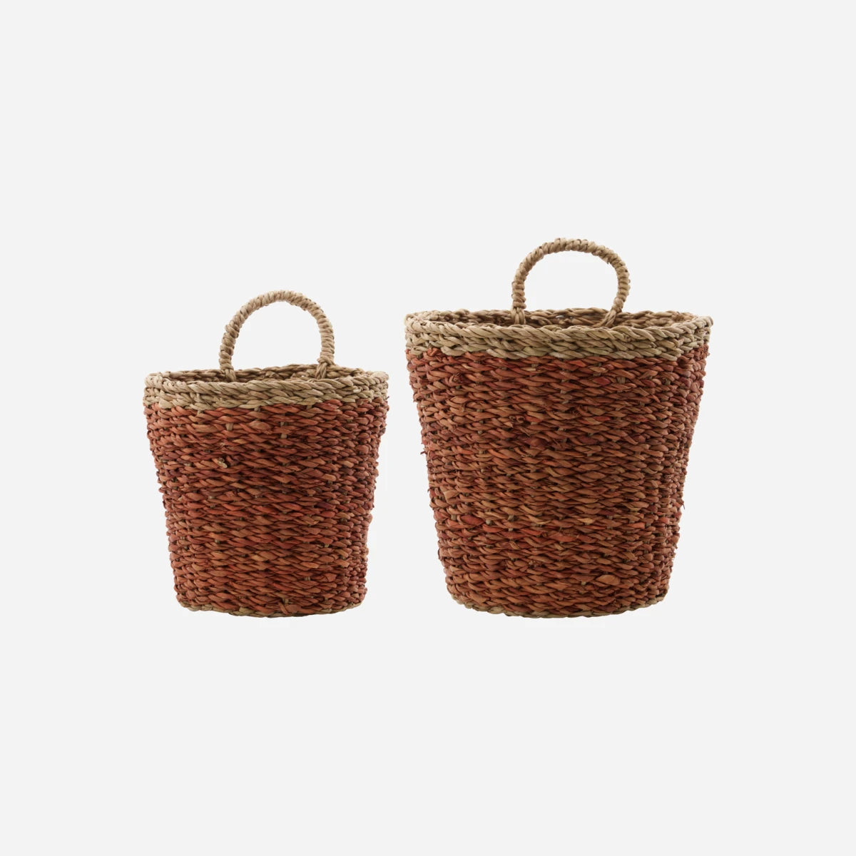 Disse håndflettede HDHere-kurve i brun søgræs skaber varme og tekstur til indretningen. Brug dem til praktisk opbevaring eller som urtepotteskjulere til planter.