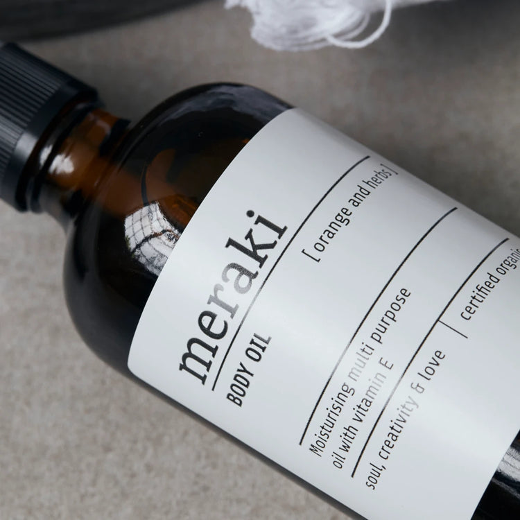 Forkæl din krop med denne økologisk certificerede og nærende body oil fra Meraki. Olien kan bruges til alt lige fra kropsolie, massageolie, makeupfjerner, til tørre hudområder og hårspidser eller ved barbering. Den indeholder økologiske olier fra sesam, olien og rasp, der fugter, nærer og blødgør huden. Tilføj et par dråber til din shampoo eller ansigtscreme for en ekstra fugtgivende virkning. Olien kommer i en flot glasflaske, som du nemt kan have stående fremme for et dekorativt look. 100 ml. Certificeret COSMOS økologisk af Ecocert.