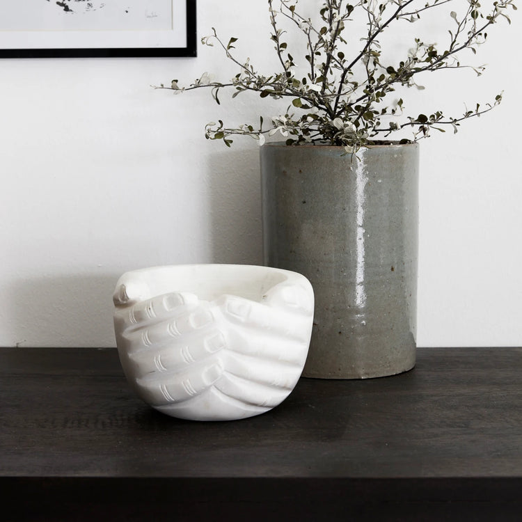 Hands fra House Doctor er en smuk og dekorativ skål, der er fremstillet i marmor. Skålen er dekoreret således, at to hænder udgør selve skålen, og denne dekoration gør skålen unik og enestående. Dens lyse farve er perfekt til at skabe en hyggelig og varm atmosfære i indretningen. Brug skålen som dekoration og fyld den med nips eller endda kogler i de kolde vintermåneder og skab en lun og hyggelig stemning i hjemmet.
