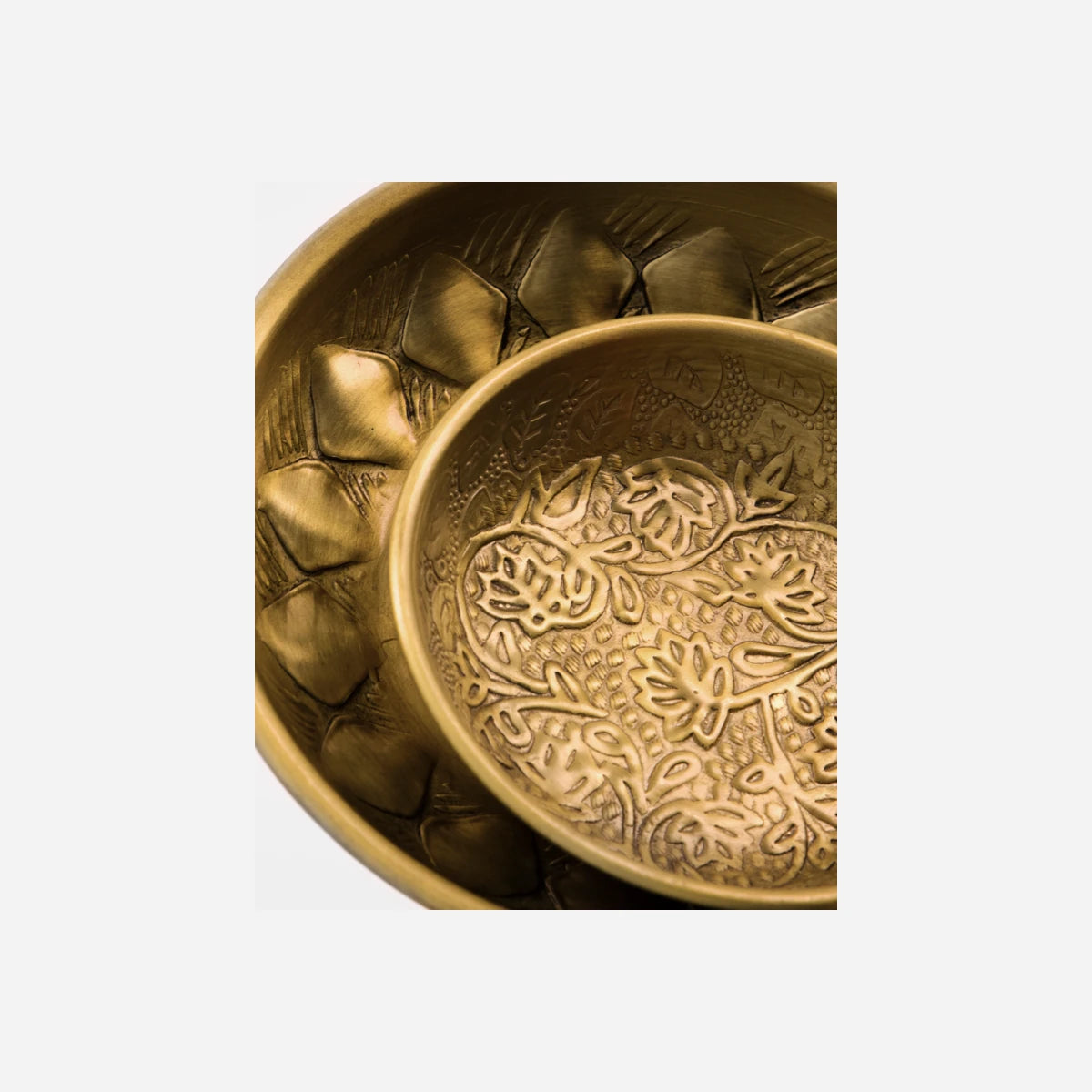 Tilføj varme og raffinement til dit hjem med dette sæt af to håndlavede gyldne skåle. Disse dekorative stykker er fremstillet af aluminium og har et fantastisk præget mønster og en antik finish. Skålene er perfekte til små bloklys eller smykker og giver uendelige muligheder for styling.- Håndlavet for unik charme- Antik gylden finish- Detaljer med præget mønster- Alsidig dekorativ brugTilføj et strejf af elegance til dit hjem med disse alsidige skåle.