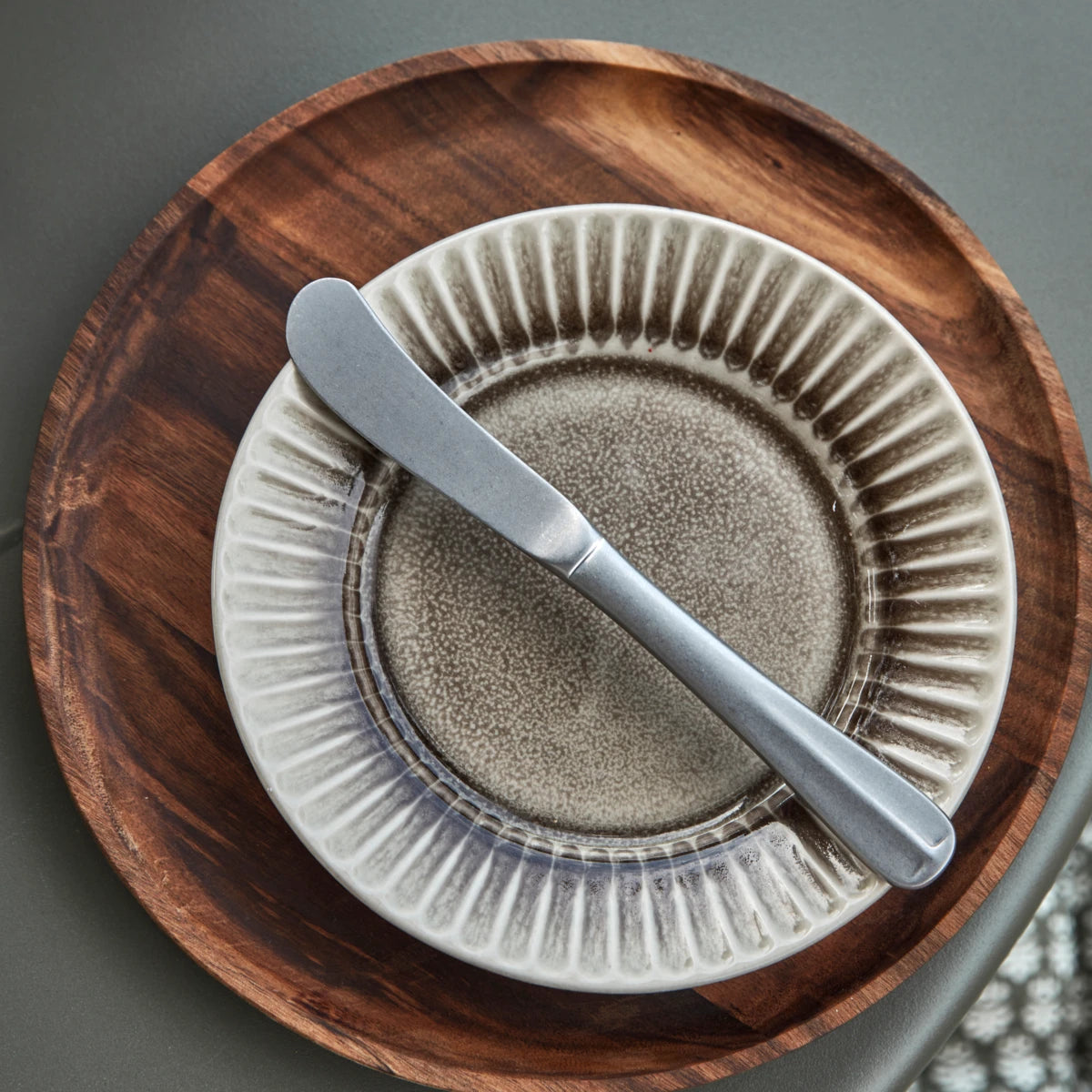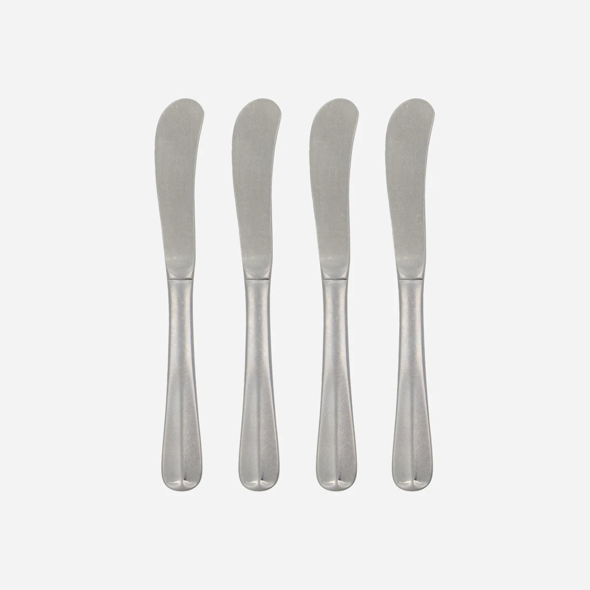 Tilføj et subtilt strejf af raffinement til din borddækning med disse smørknive. De er fremstillet af holdbart rustfrit stål og har en sølvfarvet finish, der giver en elegant og moderne æstetik. Knivene er designet med henblik på komfort og lethed og glider let, hvilket gør dem perfekte til at smøre smør eller dine yndlingsprodukter på. Dette sæt med fire knive kombinerer praktisk anvendelighed med raffineret stil og skaber en indbydende atmosfære til ethvert måltid.- Rustbestandigt rustfrit stål- Elegant sølvfinish- Komfortabelt ergonomisk design- Sæt med fire deleSkab en stilfuld madoplevelse med disse elegante smørknive.