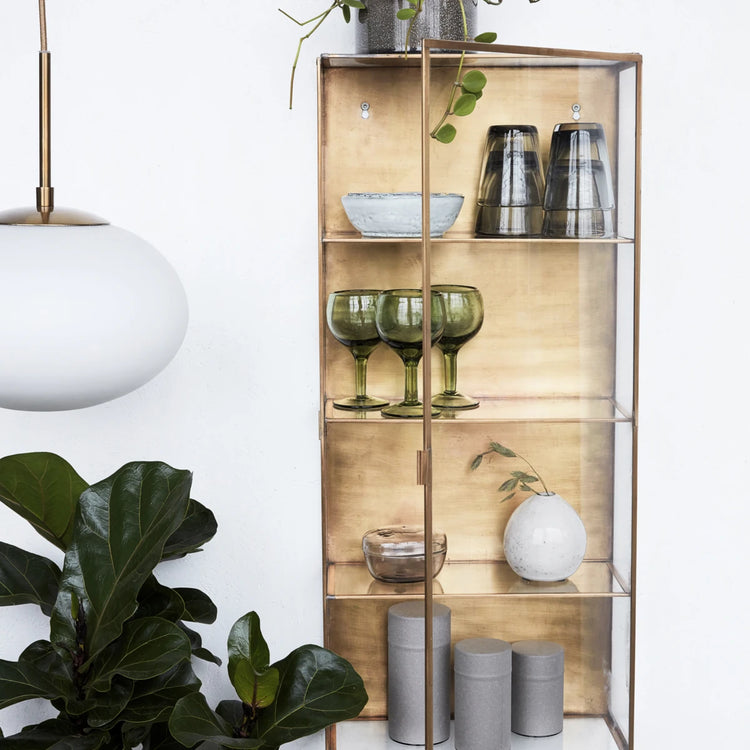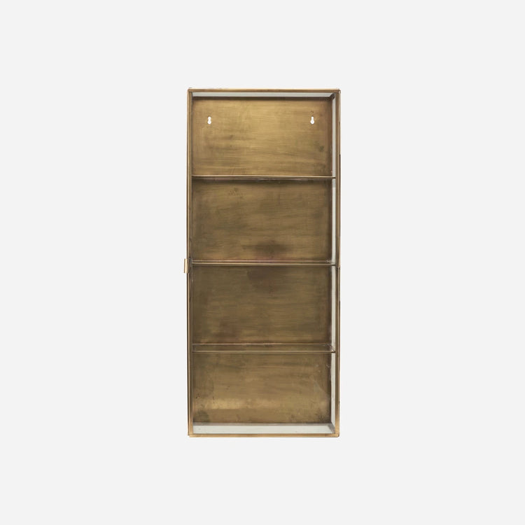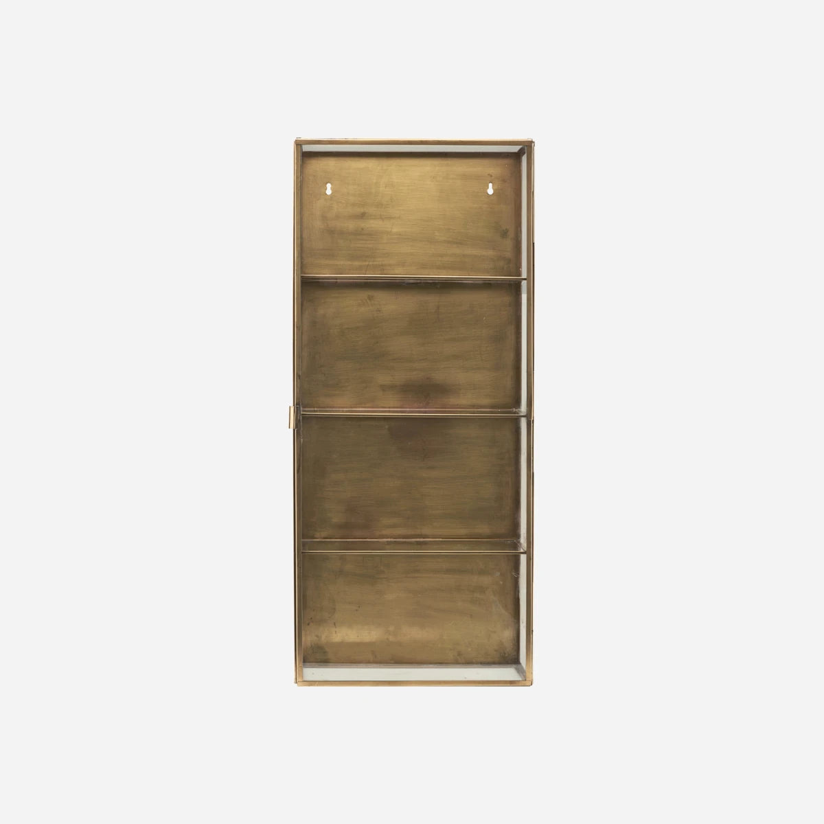 Skab et personligt blikfang i din indretning. Med Glass fra House Doctor får du vægskab, der er fremstillet i glas og messing. Skabet har en glaslåge, messingbaggrund og 3 hylder, som skal tørres af med en tør klud. Den flotte messingfarve til skille sig ud i din indretning og tilføje personlighed. Brug skabet til de personlige ejendele, du gerne vil vise frem i din indretning. Måske i køkkenet til dine krydderurter og vinglas.