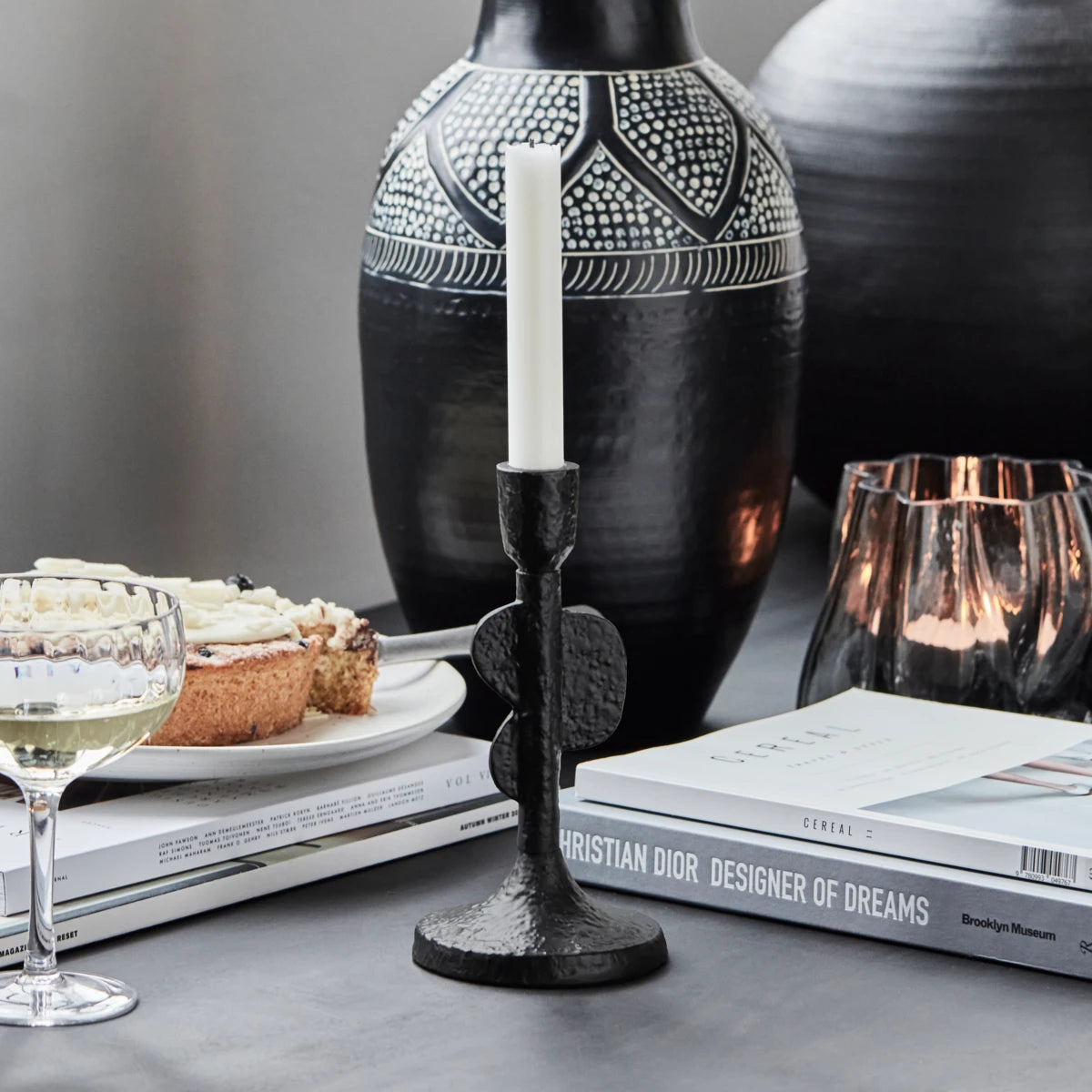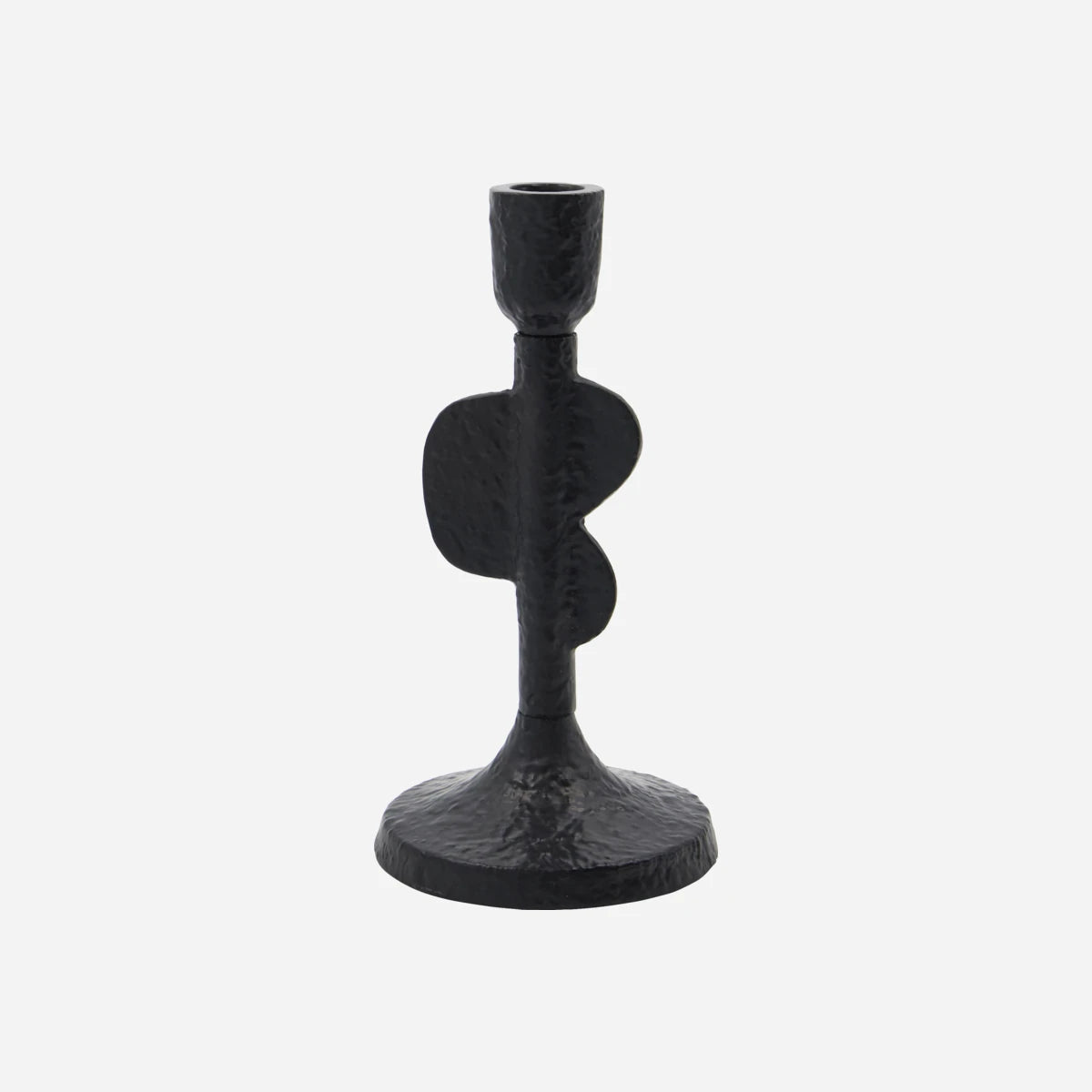 Denne lysestage er fremstillet af sort støbt aluminium og er et moderne mesterværk, der kan stå som et lille kunstobjekt i sig selv. Dens unikke og fængslende form gør den til en spændende tilføjelse til din boligindretning. Placer den på spisebordet eller kaminhylden for at skabe et kunstnerisk fokuspunkt.- Sort støbt aluminium- Moderne og spændende design- Kunstnerisk dekorativt stykke- Stabil og holdbarStil din bolig med denne kunstneriske lysestage, og nyd dens visuelle appel.