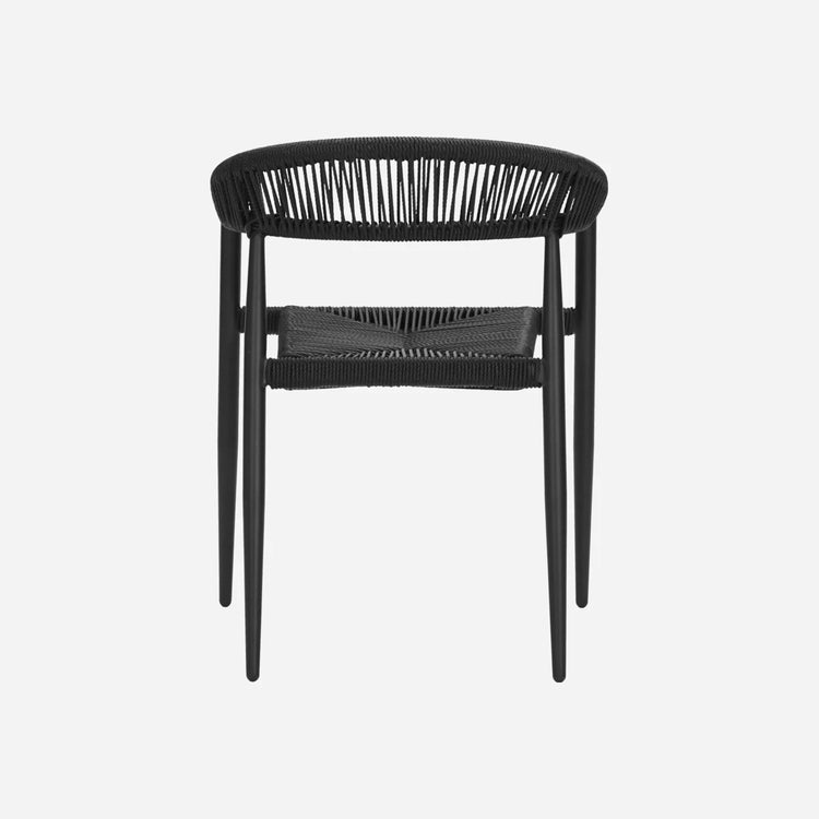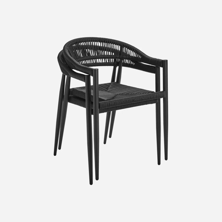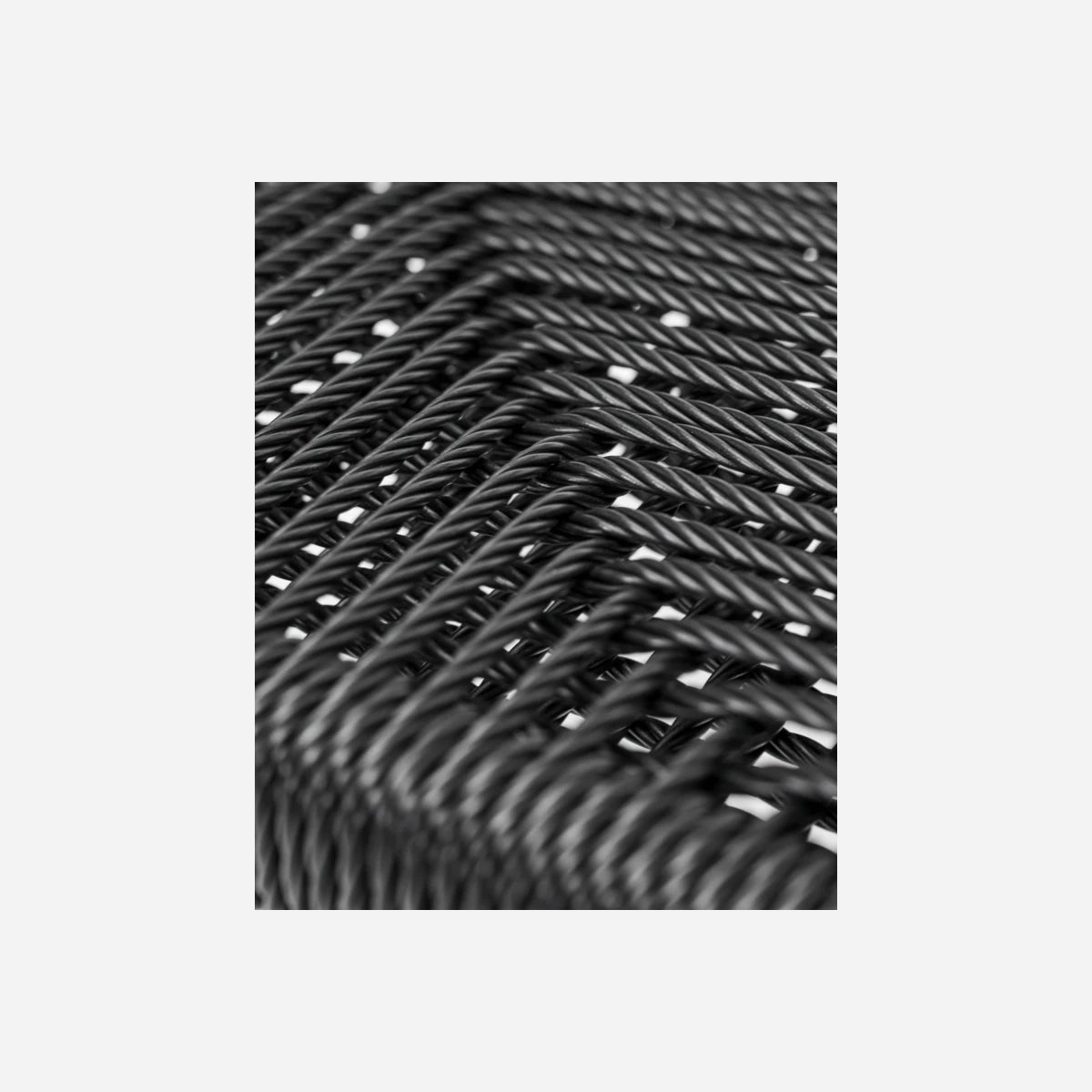 HDCoon-stolen kombinerer et spinkelt stel af aluminium med et detaljeret flet i syntetisk rattan. Det sorte design forener lethed og styrke med et raffineret udtryk fuld af tekstur.