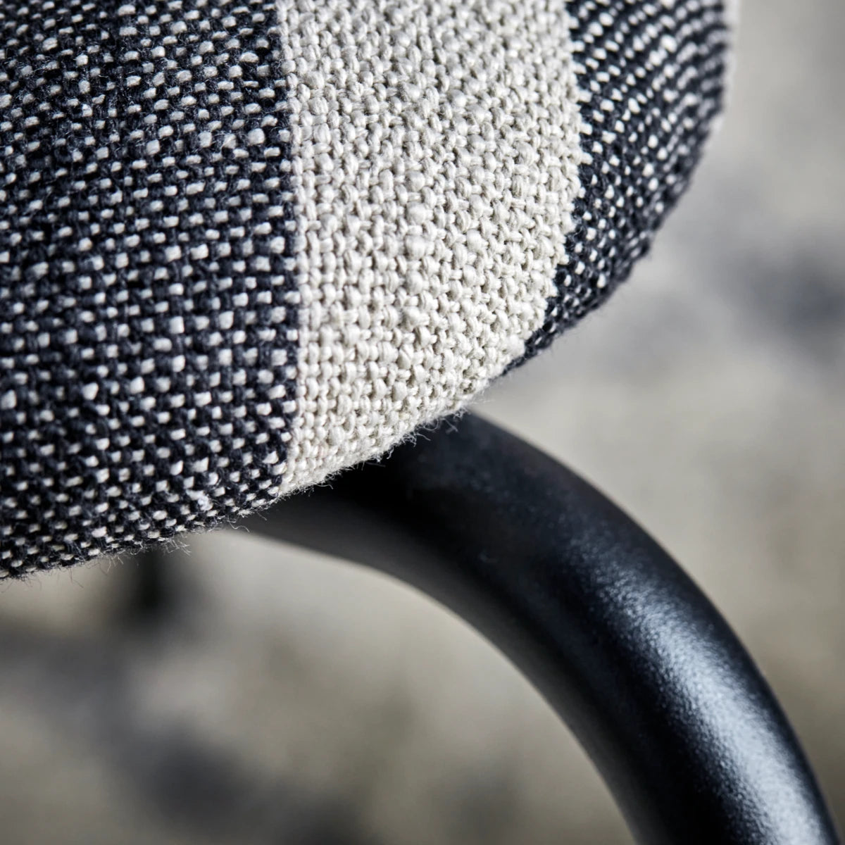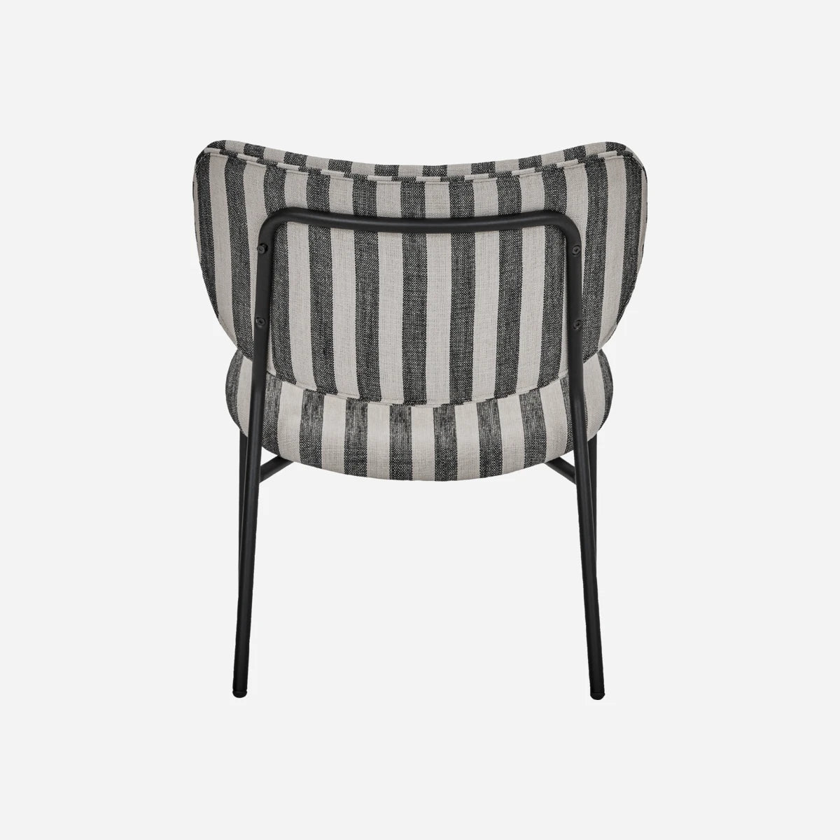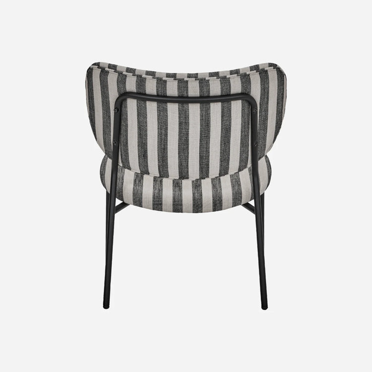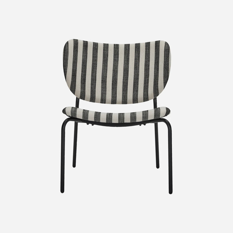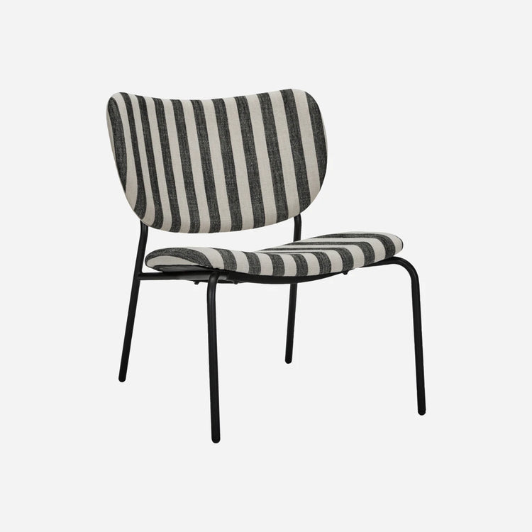 Med denne stilfulde loungestol kan du skabe et elegant og moderne udtryk i ethvert rum. Stolen har sort og hvidt stribet polyesterstof og slanke, sortlakerede stålben, der giver både komfort og et moderne æstetisk præg. Den fungerer godt både alene og i grupper, hvilket tilføjer et rent og stramt look til din indretning.- Ergonomisk polstret sæde- Holdbart polyesterstof- Robuste stålben- Alsidig til forskellige miljøerGiv din indretning et løft med denne iøjnefaldende loungestol.