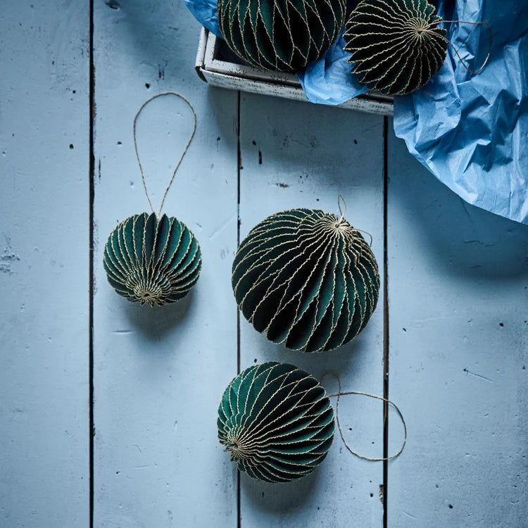 Tilføj et strejf af magi til din juleudsmykning med disse håndlavede papirsornamenter i en smuk grøn farve. De fine deckle-kanter med gyldent glitter skaber en elegant kontrast og tilføjer et festligt præg.