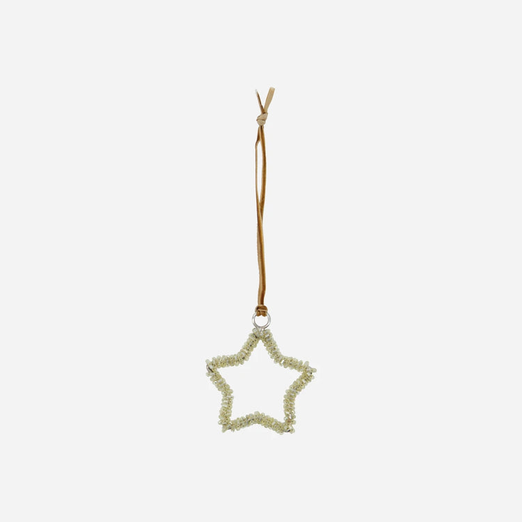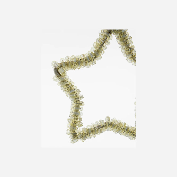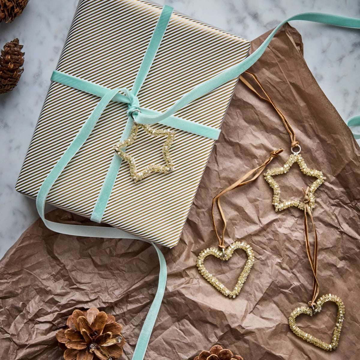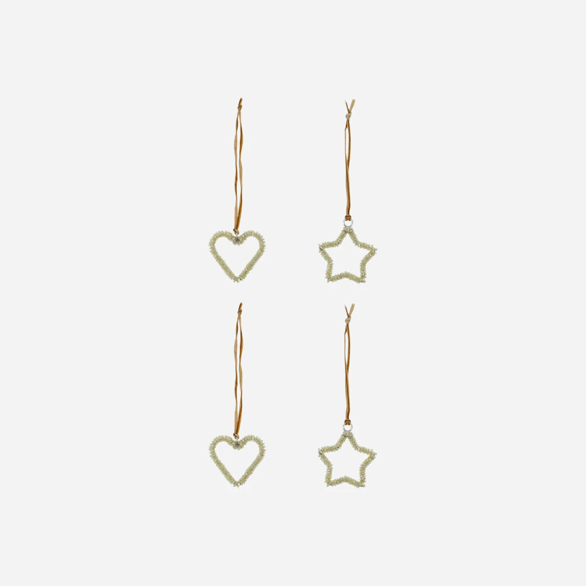 Tilføj et strejf af elegance til din juleudsmykning med disse smukke ornamenter i champagnefarve. Skabt af jern og dekoreret med glitrende perler, de præsenterer klassiske hjerte- og stjerneformer, der fejrer julens magi.