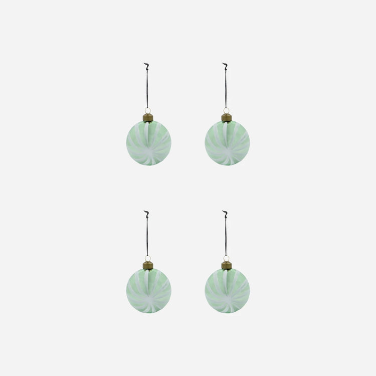 Tilføj et strejf af elegance til din juleudsmykning med disse unikke ornamenter i mundblæst glas. Den sofistikerede mintgrønne farve kombineret med hvidt glimmermønster skaber en fortryllende visuel effekt. Ornamenternes runde, let flade form giver et moderne og stilfuldt udtryk, der skiller sig ud fra traditionel julepynt.