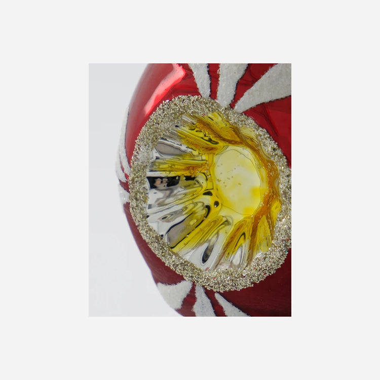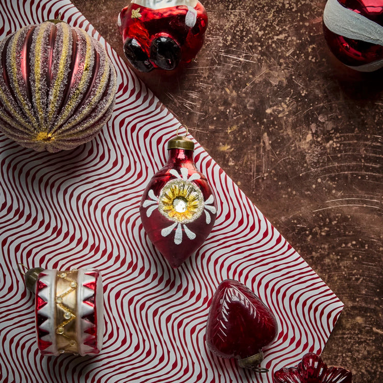 Skab en nostalgisk julestemning med disse smukke mundblæste glasornamenter. Det røde dråbeformede design, kombineret med det håndmalede hvide mønster, bringer traditionel elegance ind i dit hjem. Den guldfarvede fordybning med sølvglimmerkant tilføjer et skinnende touch, der gør disse ornamenter til en uimodståelig del af din juleudsmykning.