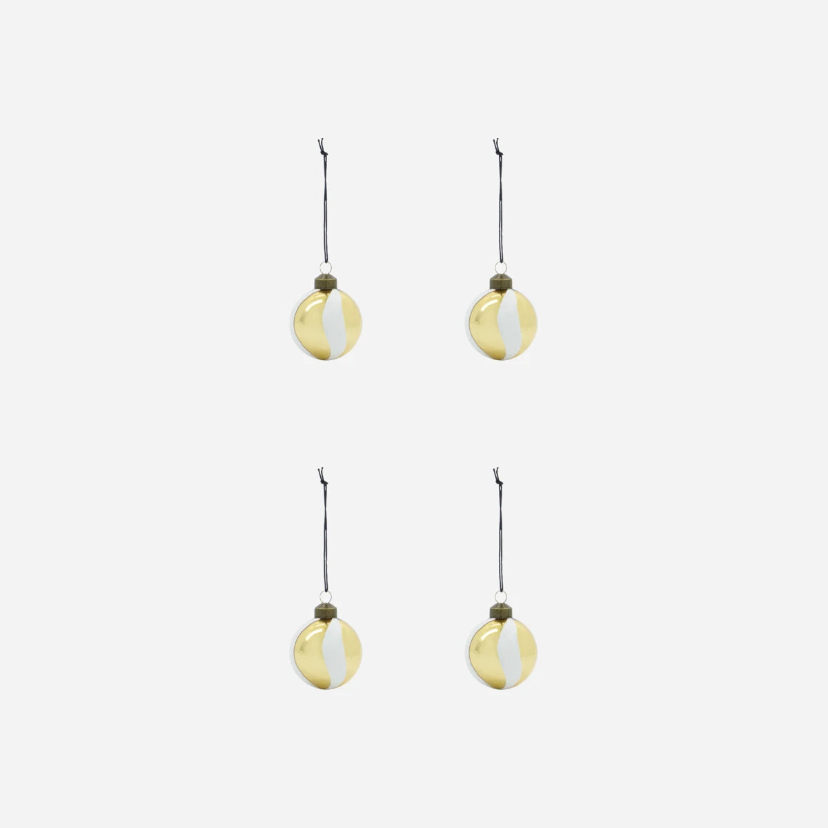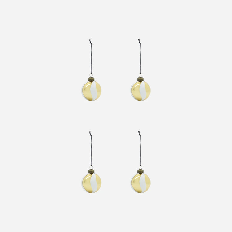 Tilføj et strejf af elegance til din juleudsmykning med disse smukke ornamenter i mundblæst glas. Sættet består af fire kugler, hver med en unik twistet stribe i hvid glimmer på en gylden base, der skaber en sofistikeret og legende stemning.