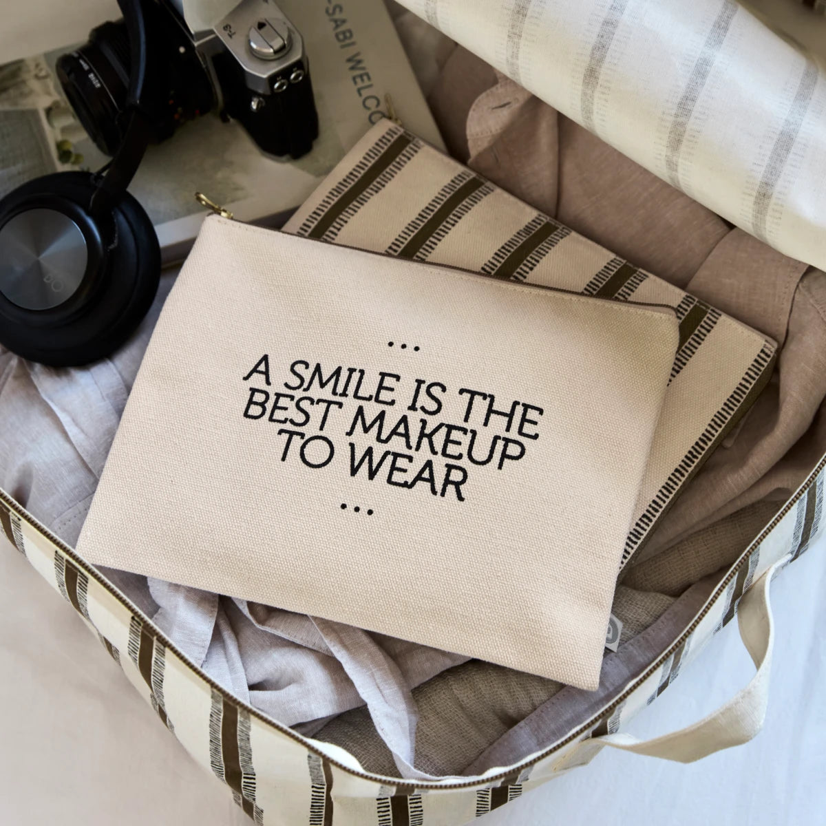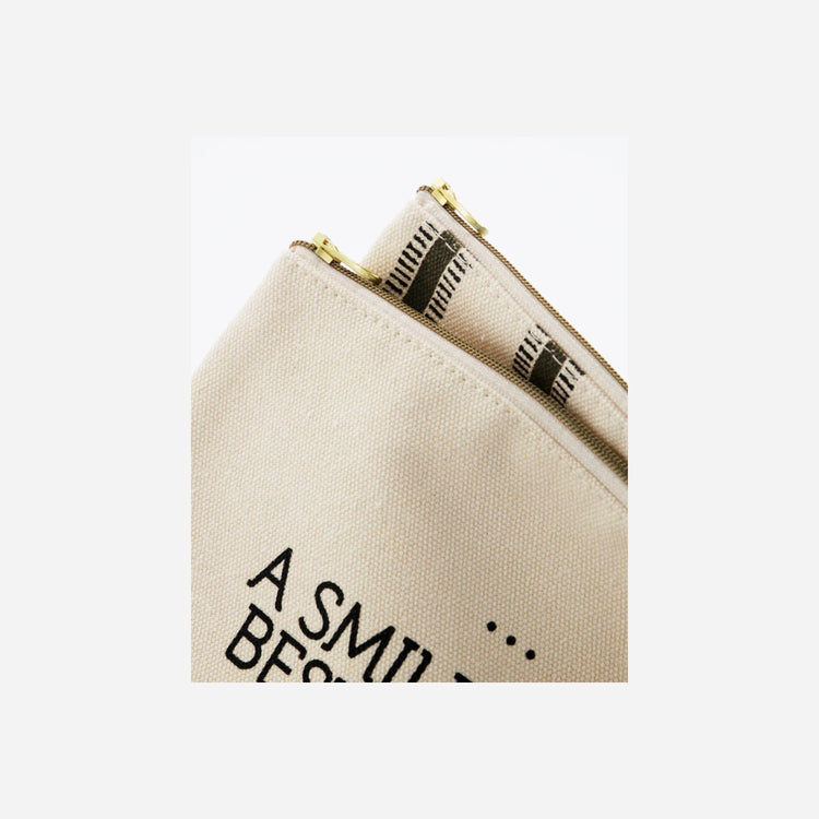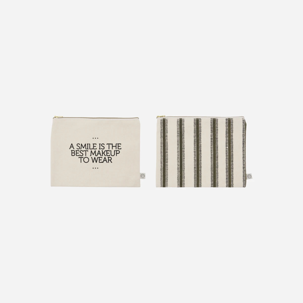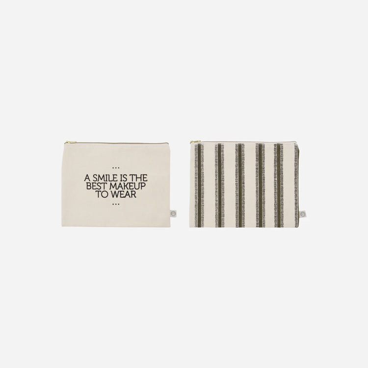 Tilføj et strejf af elegance til dine accessories med dette sæt af to håndlavede clutches. Disse clutches i kanvas er fremstillet af en blanding af polyester, bomuld og polyamid og har et stilfuldt sort og råhvidt design, der passer til ethvert outfit. Den ene clutch er prydet med et subtilt brunt mønster, mens den anden har en elegant sort tekst, hvilket gør dem perfekte til opbevaring af makeup eller andre små ting. Hvert stykke er unikt på grund af små variationer i finish, farve og størrelse, hvilket giver dig en helt unik accessory.- Stilfuldt sort/off-white design.- Håndlavet med unikke variationer.- Ideel til opbevaring af makeup.- Slidstærkt lærredsmateriale.Tilføj disse alsidige clutches til din samling for at få både stil og funktionalitet.