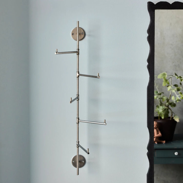 Håndlavet knagerække med elegant sølvfinish giver et skulpturelt udtryk i din entré eller garderobe. De fem kroge kan drejes og tilpasses til din hverdag – både smukt og praktisk i ét.