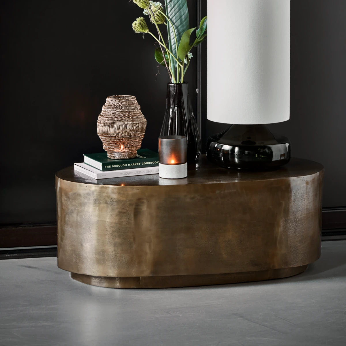 Dette håndlavede sofabord i aluminium med antik messingfinish bliver et blikfang i enhver stue eller loungeområde. Det unikke design tilføjer sofistikation og elegance til din indretning.- Håndlavet, unikt design- Antik messingfinish- Alsidig til forskellige rum- Blikfang og statement pieceGiv dit hjem et elegant præg i dag!