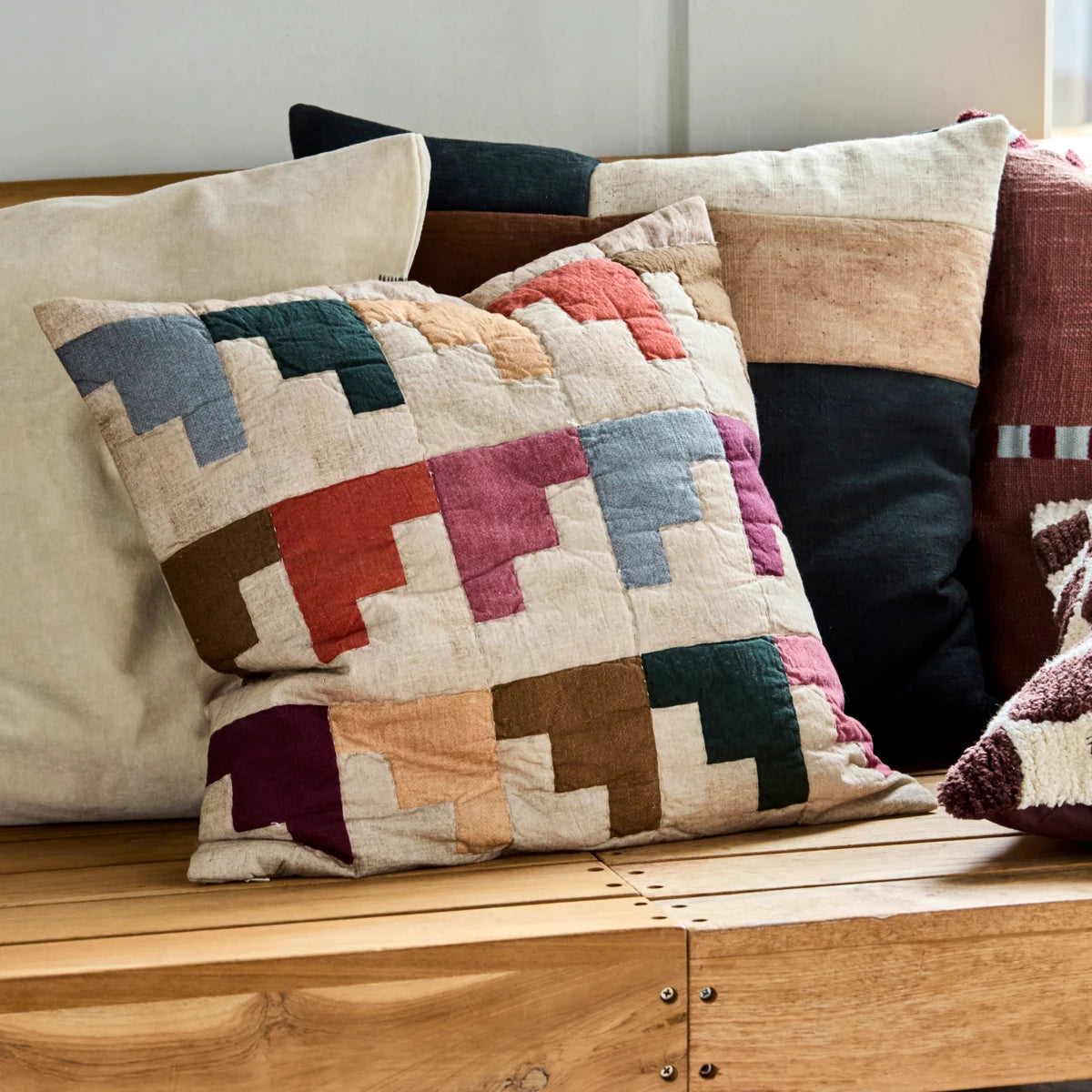 Pudebetrækket skaber energi og karakter i din indretning med sit håndtrykte, grafiske mønster og fine håndbroderede stikninger.