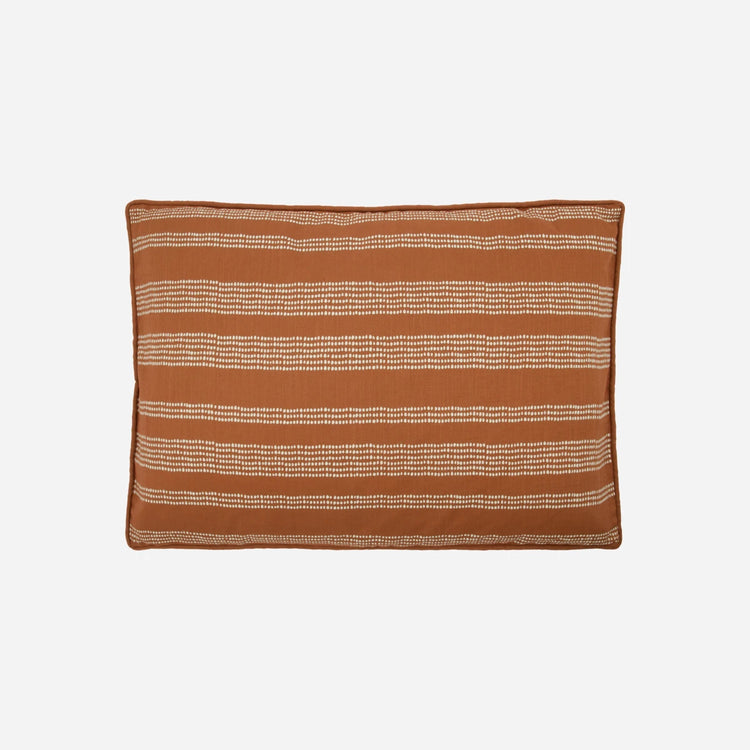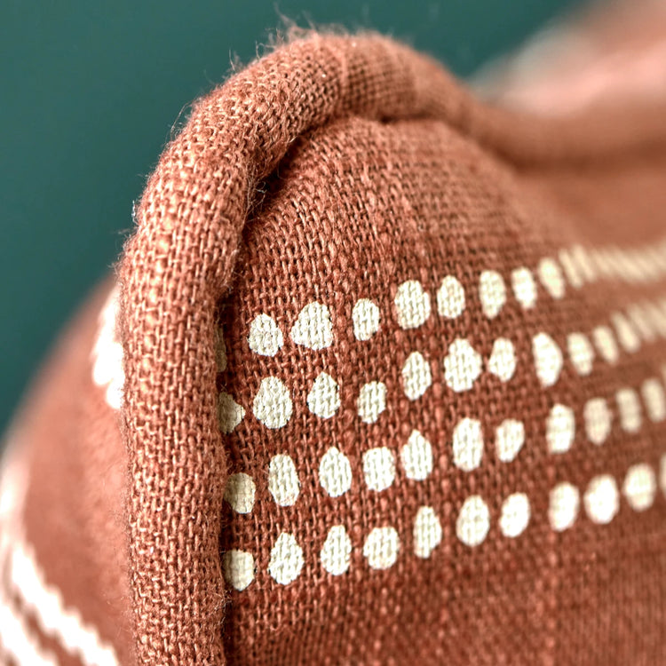 Bring et hyggeligt præg på din sofa med dette pudebetræk i en varm terracotta nuance. Den er lavet af blødt bomuld og har et charmerende mønster af håndtrykte prikker, der danner striber. Den ensfarvede rørføring tilføjer en raffineret kant, hvilket gør den til en stilfuld og uundværlig tilføjelse til din stue. Pudebetrækkets kvalitet er sikret af dets Oeko-tex- certificering, hvilket giver dig ro i sindet i dine valg af boligindretning . - Oeko-tex certificeret - Håndtrykt prikmønster - Blødt bomuldsmateriale - Ensfarvede kanter Tilføj et strejf af varme og stil til dit opholdsrum med dette pudebetræk.