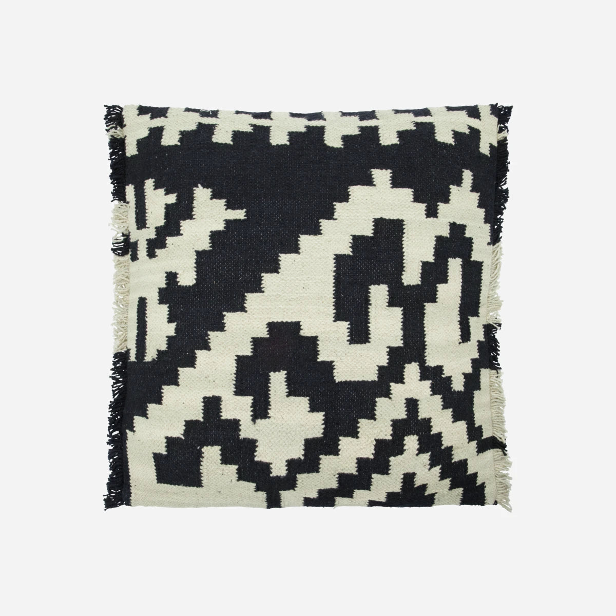 Dette håndlavede pudebetræk i tung bomuld har et smukt grafisk mønster i sort og sand, der tilfører din boligindretning et råt og kantet udtryk. Frynserne og lynlåslukningen fremhæver det håndværksmæssige præg, hvilket gør det til et unikt og iøjnefaldende element.- Håndlavet bomuldspudebetræk- Smukt grafisk mønster- Frynser og lynlås- Hvert stykke er uniktGiv dit hjem et kunstnerisk touch.