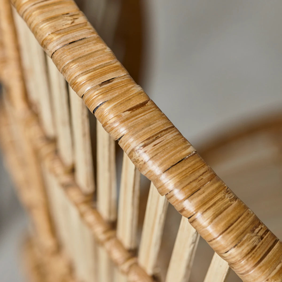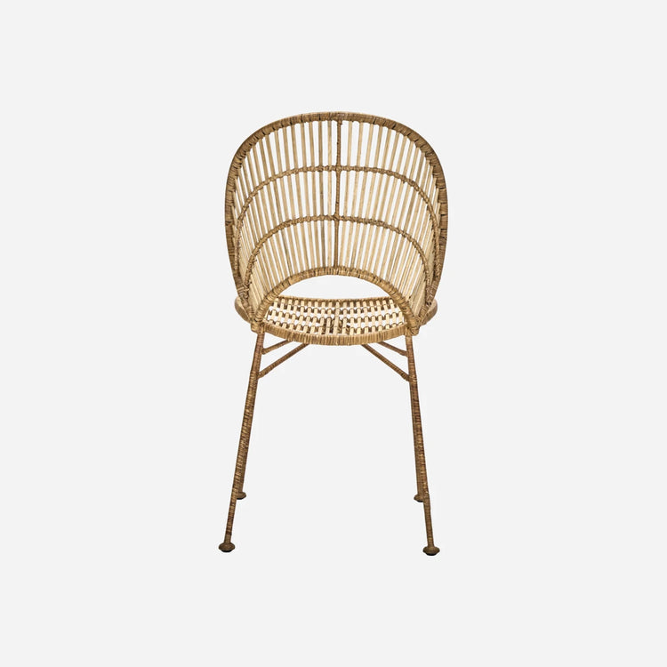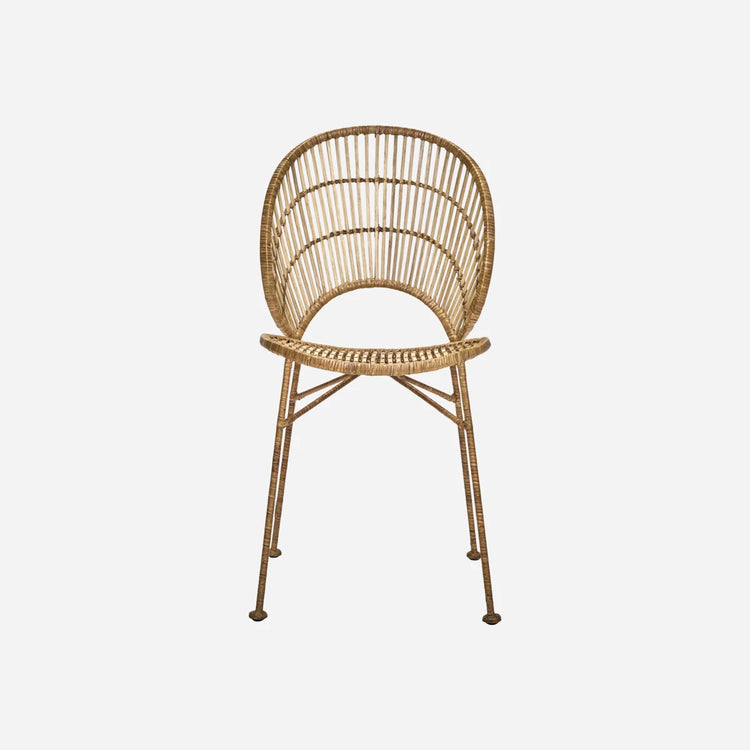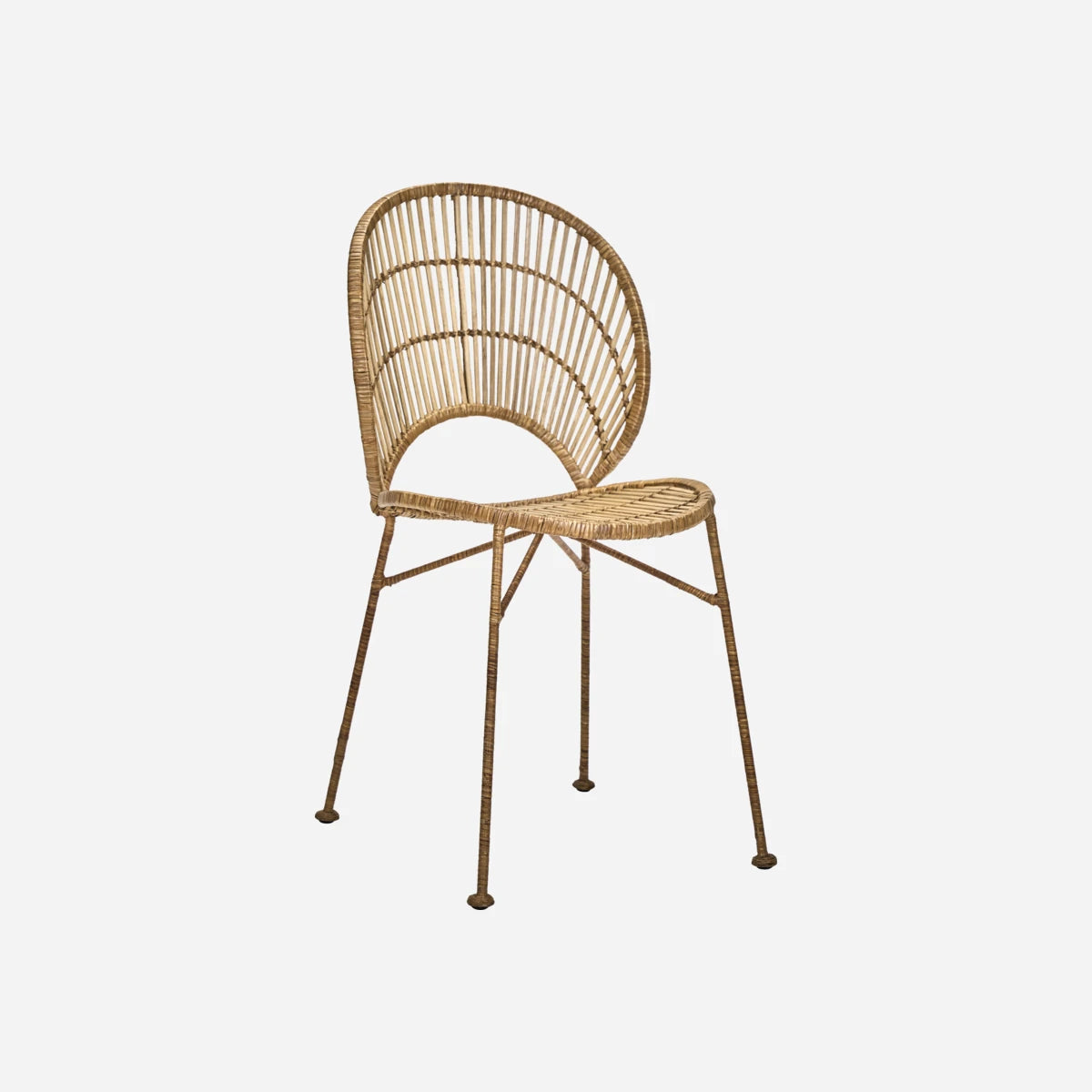 Artfully woven rattan brings natural warmth to this sophisticated dining chair, where organic texture meets contemporary design. The gently curved backrest and carefully crafted seat create an inviting silhouette, whilst the sleek iron frame adds a modern touch that perfectly balances comfort with timeless style.