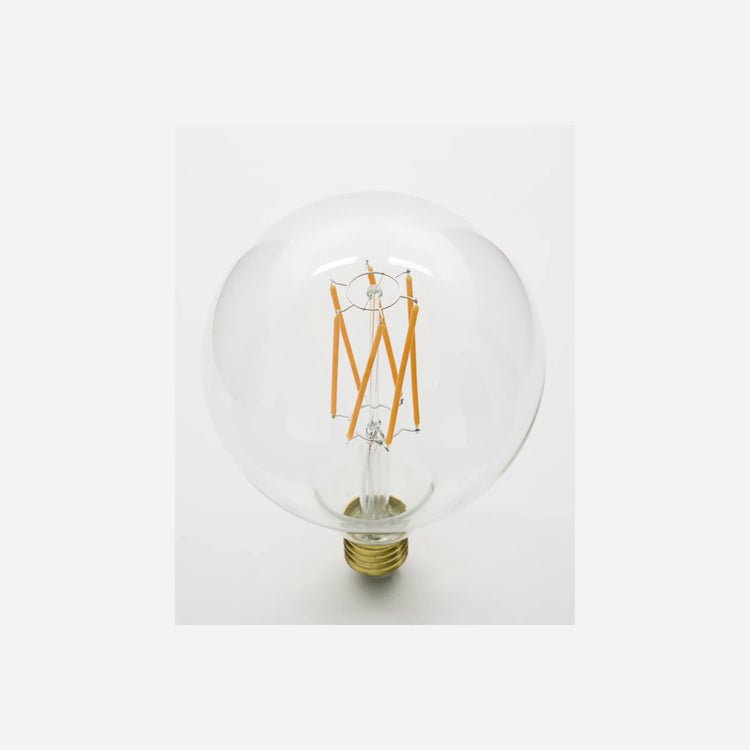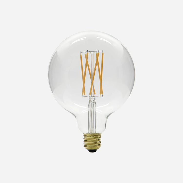Mega Edison er en stor, rund E27 LED-pære, som tilmed er dæmpbar. Pæren er gennemsigtig, og med sin store størrelse skaber den opmærksomhed i rummet. Og det uanset om du vælger at bruge den i en simpel fatning hængende fra loftet eller i en lampe, hvor hele pæren kan ses og kommer til sin ret. Her får du et blødt, varmt lys og en lavere lysstyrke på 150 lumen, som egner sig til afdæmpet hyggebelysning i hjemmet. Og da soklen er i messing, er pæren mere hårdfør.