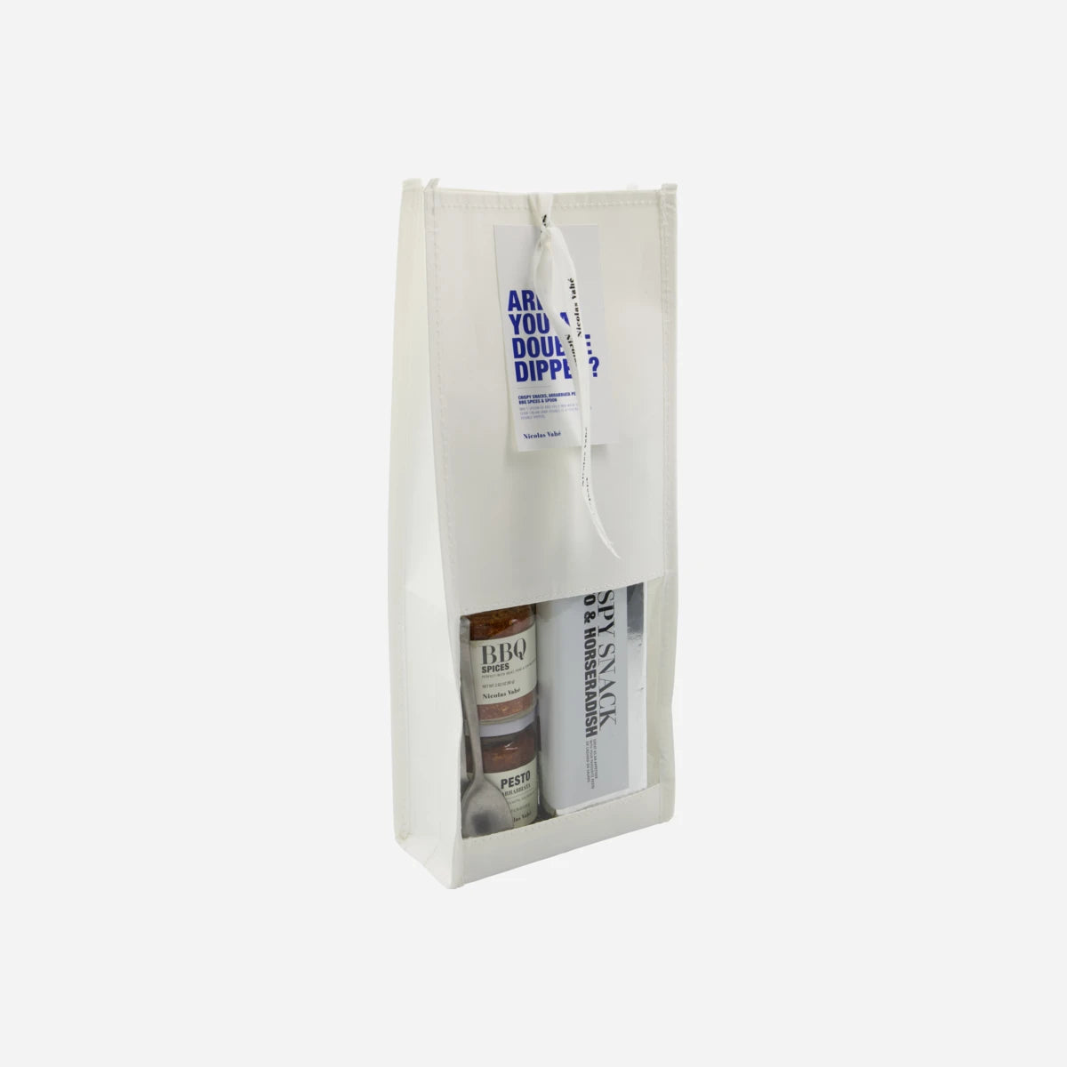En sjov gavepose fra Nicolas Vahé til smagsentusiaster. "Er du en dobbeltdypper?" indeholder lækre snacks og dips, fra peberrodschips til krydret pesto — klar til at dele eller nyde alene. Leveres komplet med en sølvfarvet teske og gavemærke.