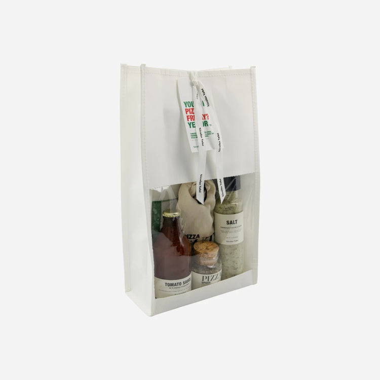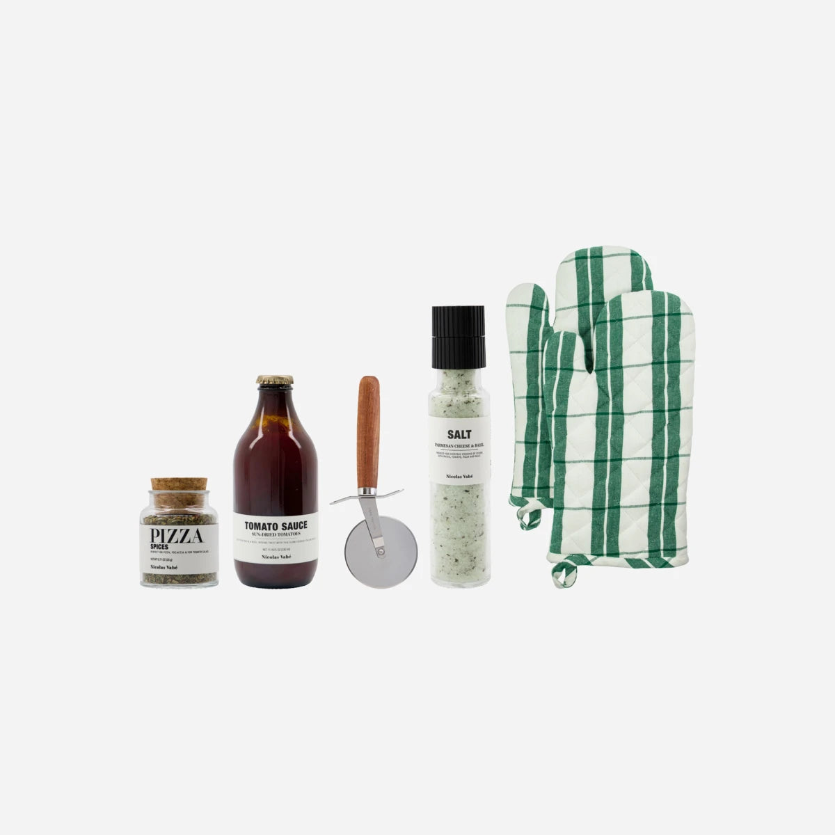 En hyggelig gavepose fra Nicolas Vahé til afslappede middage og hyggelige stunder. "You & Me, Pizza Friday" indeholder gourmet-toppings og redskaber til en afslappet hjemmelavet pizzaaften. Færdig med en grøn ovnhandske og hængemærke.