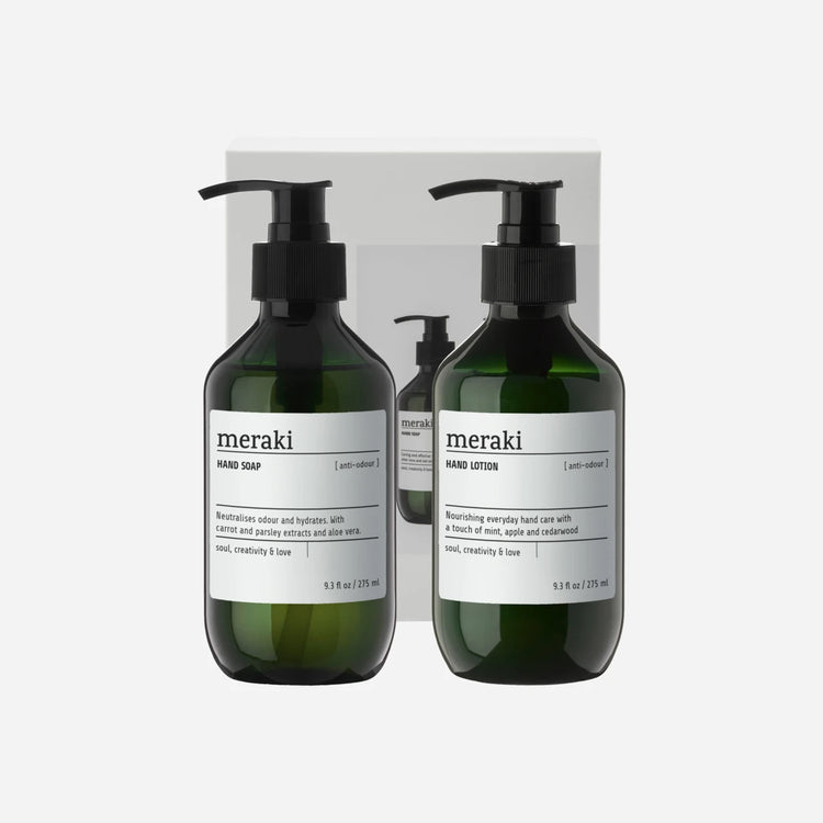"Giv dig selv eller én, du holder af, denne elegante gaveæske, der består af en anti-odour håndsæbe og håndlotion. Det minimalistiske design og de praktiske pumpeflasker giver en komplet løsning til rene og velplejede hænder.