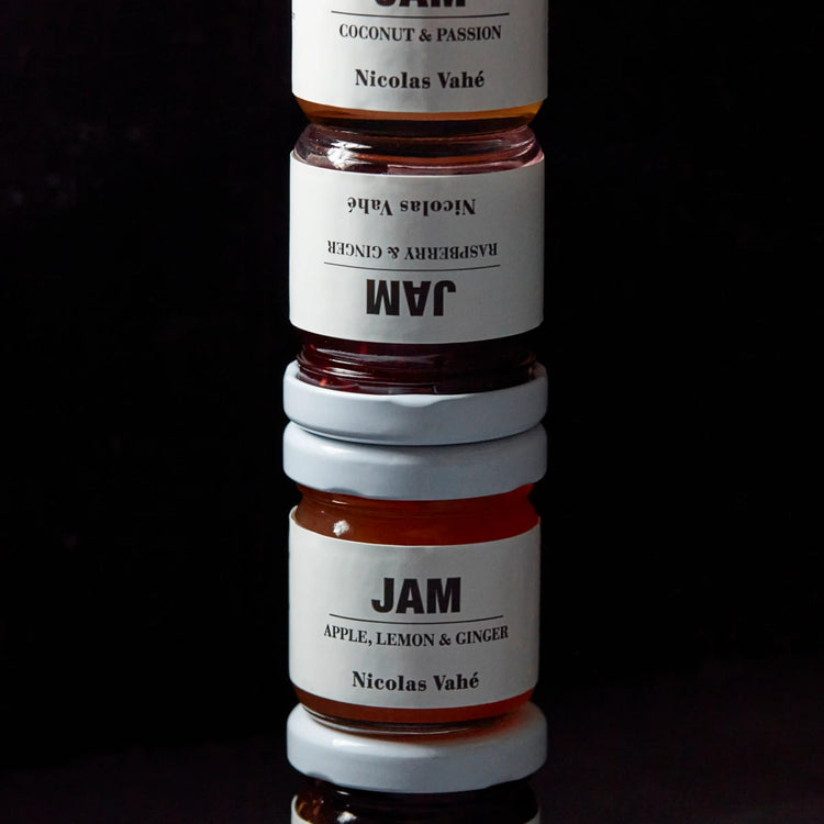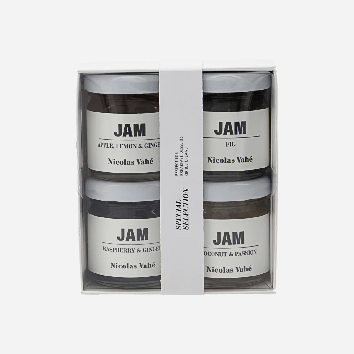 Gavepakke med fire små marmelader fra Nicolas Vahé. Marmeladerne er perfekte som en sød gave til værtinden, veninden eller naboen. Pakken består af fire smagsvarianter, der alle er lavet af kvalitetsingredienser uden kunstige konserveringsmidler eller tilsætningsstoffer, hindbær & ingefær, kokos & passionsfrugt, æble, citron & ingefær og figen. Hvert glas indeholder 40 g.