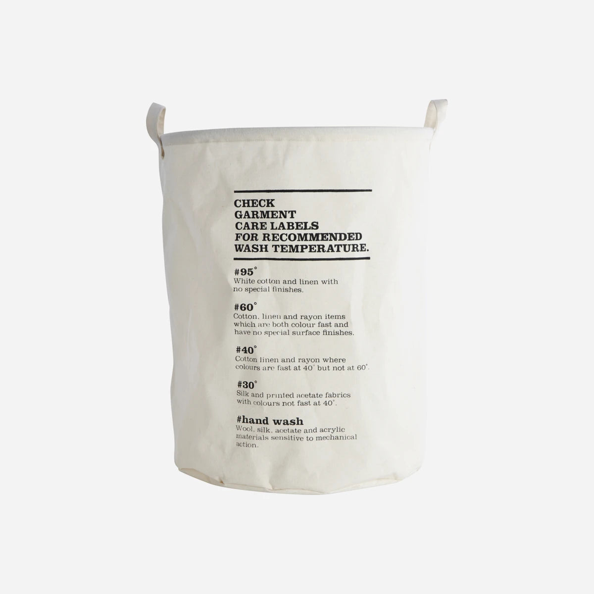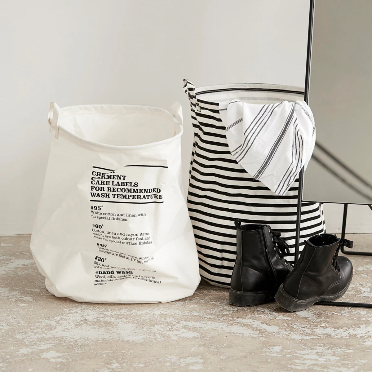 Smart og fin vasketøjspose fra House Doctor. På posen er der trykt vaskeinstruktioner, der giver posen et moderne og grafisk udtryk. Brug også posen som en flot og anderledes opbevaringsløsning på et værelse eller i gangen.