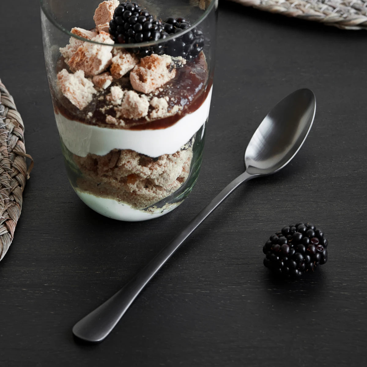 Denne lange ske kaldet Lery er ideel til at få fat i de sidste stykker lækker dessert i bunden af glasset. Den er designet af House Doctor og er lavet af rustfrit stål. Som et sidste touch giver farven gunmetal skeen et uformelt og køligt udtryk. Sæt den sammen med resten af Lery-bestikket, og dæk et personligt bord ved at kombinere med din yndlingsservice. Takket være den mørke nuance får din borddækning et diskret, men alligevel elegant touch. Skeen har fået en farvet belægning, og derfor anbefaler vi, at den vaskes op i hånden for at forlænge farven og holdbarheden.