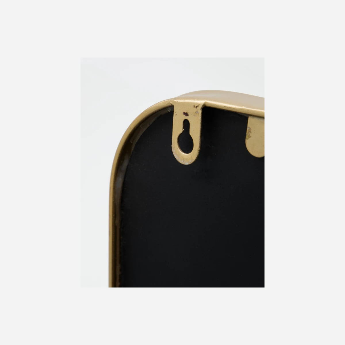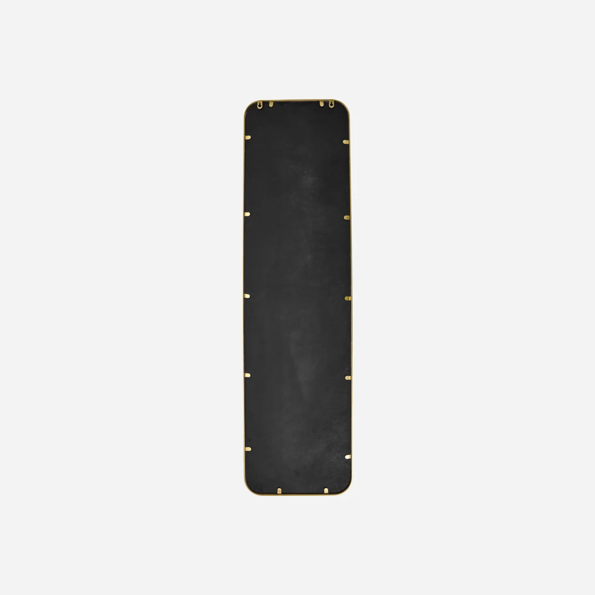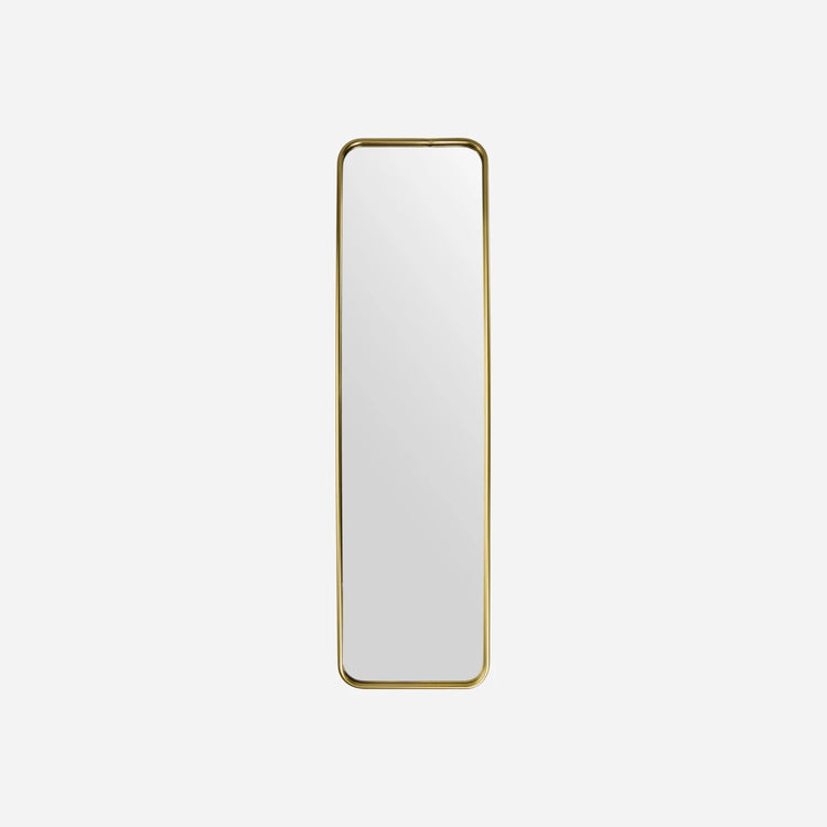 Med dette aflange spejl i gylden ramme skaber du en elegant og sofistikeret stemning i dit hjem. Den minimalistiske form med bløde, afrundede hjørner sætter et moderne præg på enhver indretning, mens den gyldne finish reflekterer lyset smukt og giver rummet dybde og karakter.