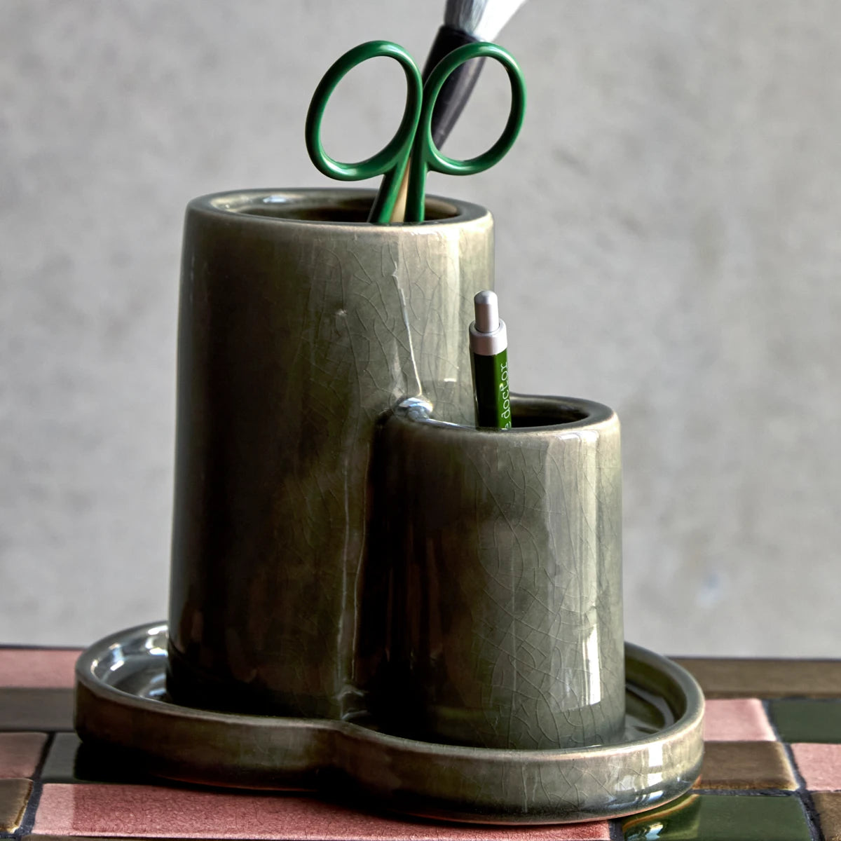 Denne keramiske organizer er håndlavet med præcision og bringer både stil og orden til dit hjemmekontor. Dens glaserede grå overflade udstråler en moderne charme, som gør den til en dekorativ og funktionel tilføjelse til ethvert miljø. Med sine to holdere kan den effektivt opbevare sakse, kuglepenne og andre små ting, hvilket giver et strejf af elegance og funktionalitet, uanset om den placeres på kontoret, i køkkenet eller i stuen. Lad dette møbel lyse op i din indretning med sit kunstfærdige design og sine organisatoriske evner.- Håndlavet keramisk håndværk- Design af holder til to formål- Elegant glaseret finishTilfør et strejf af stil og orden i dit hjem med denne keramiske perle.