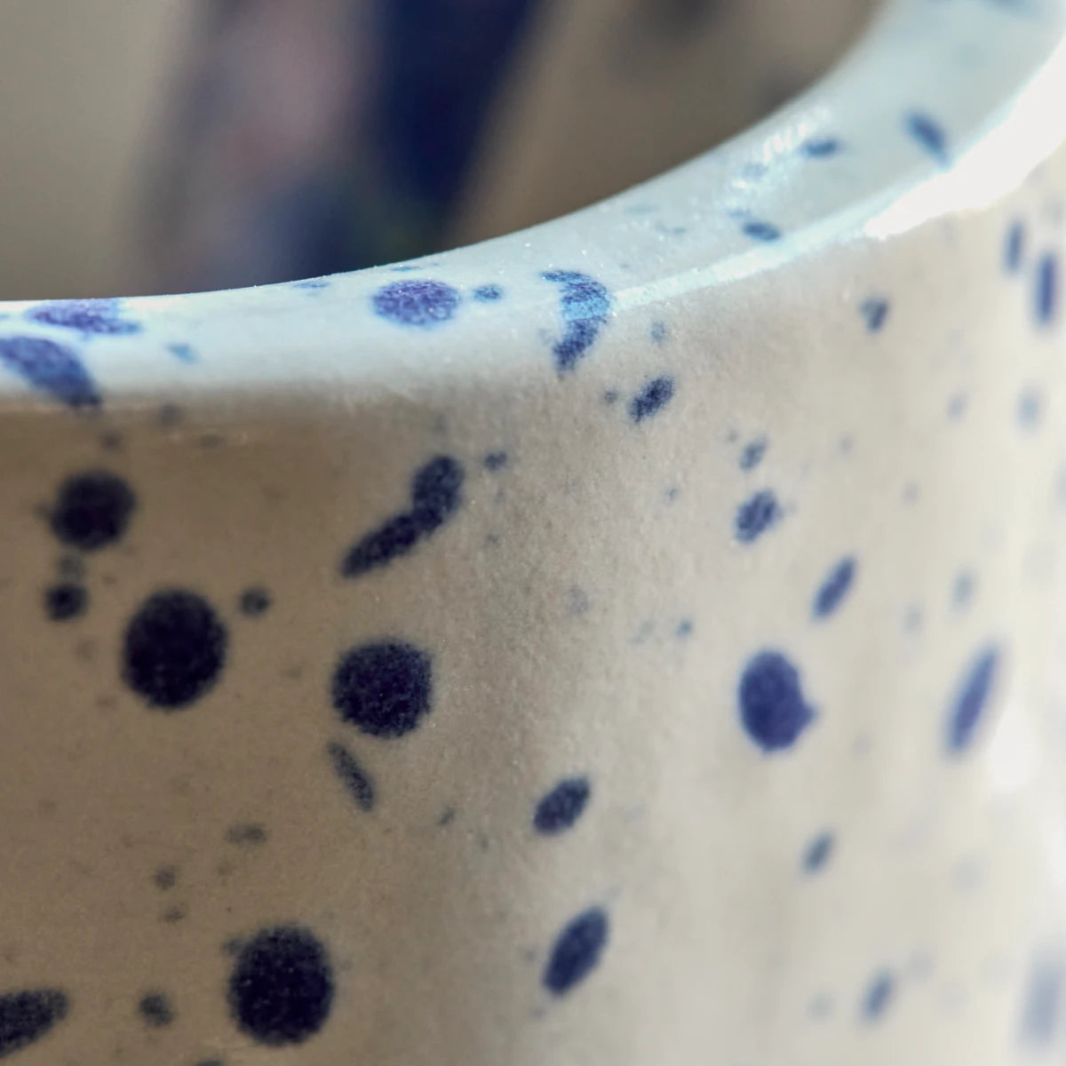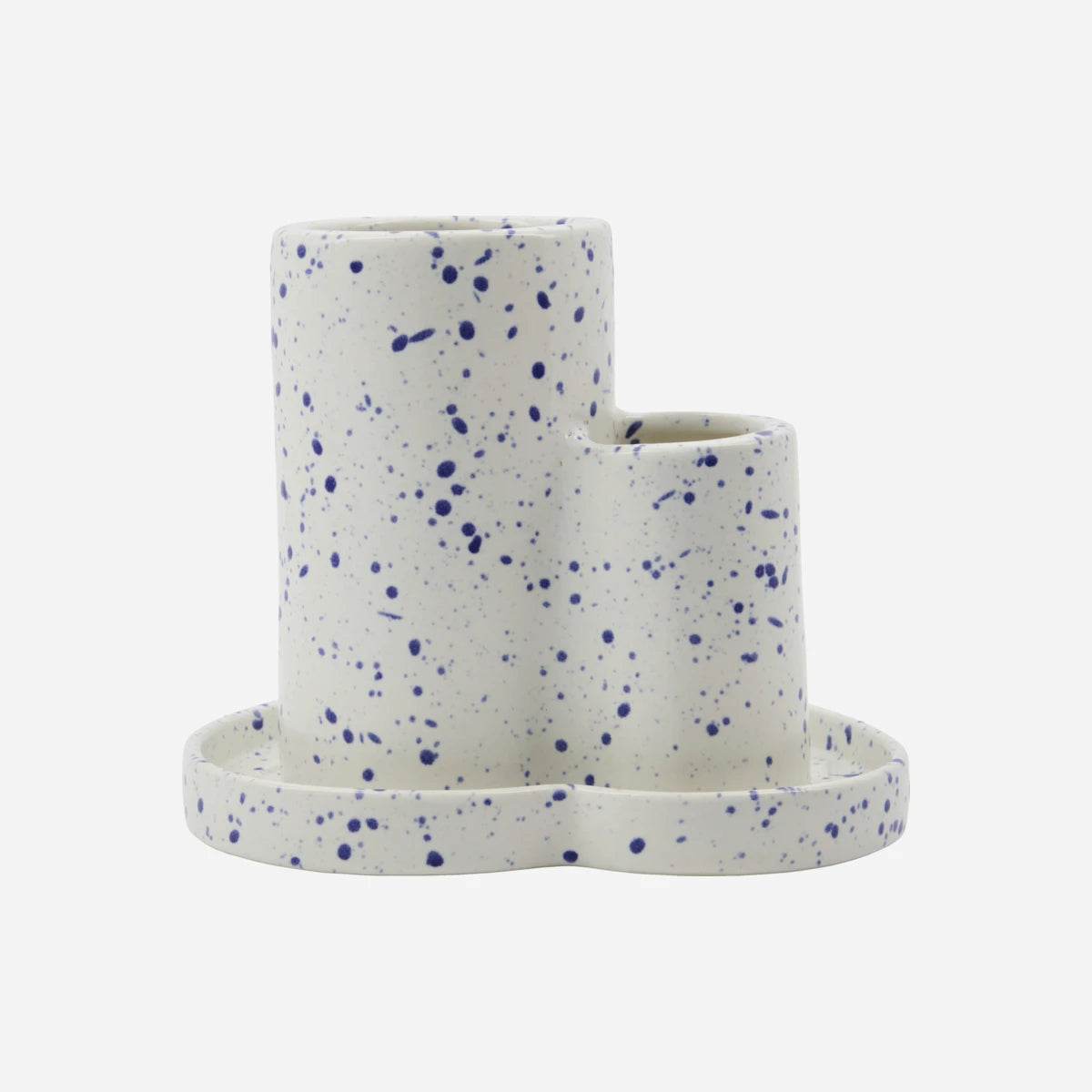 Håndlavet i keramik byder denne unikke organizer på funktionalitet og æstetisk appel. Den off-white base med et skønt blåt splash mønster bringer modernitet til dit hjemmekontor, køkken eller stue. Perfekt til opbevaring af sakse, kuglepenne og småting. To varierede cylindriske holdere giver fleksibilitet og stil.- To holdere i ét.- Håndlavet keramisk design.- Moderne farve og mønster.- Ideel til opbevaring på kontoretBring stil og orden til dit arbejdsområde med denne alsidige organisering.