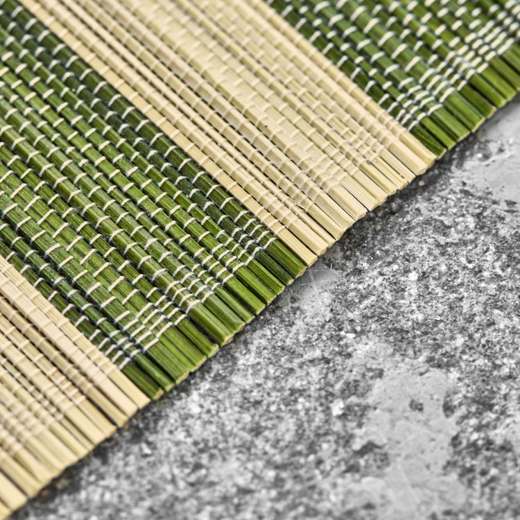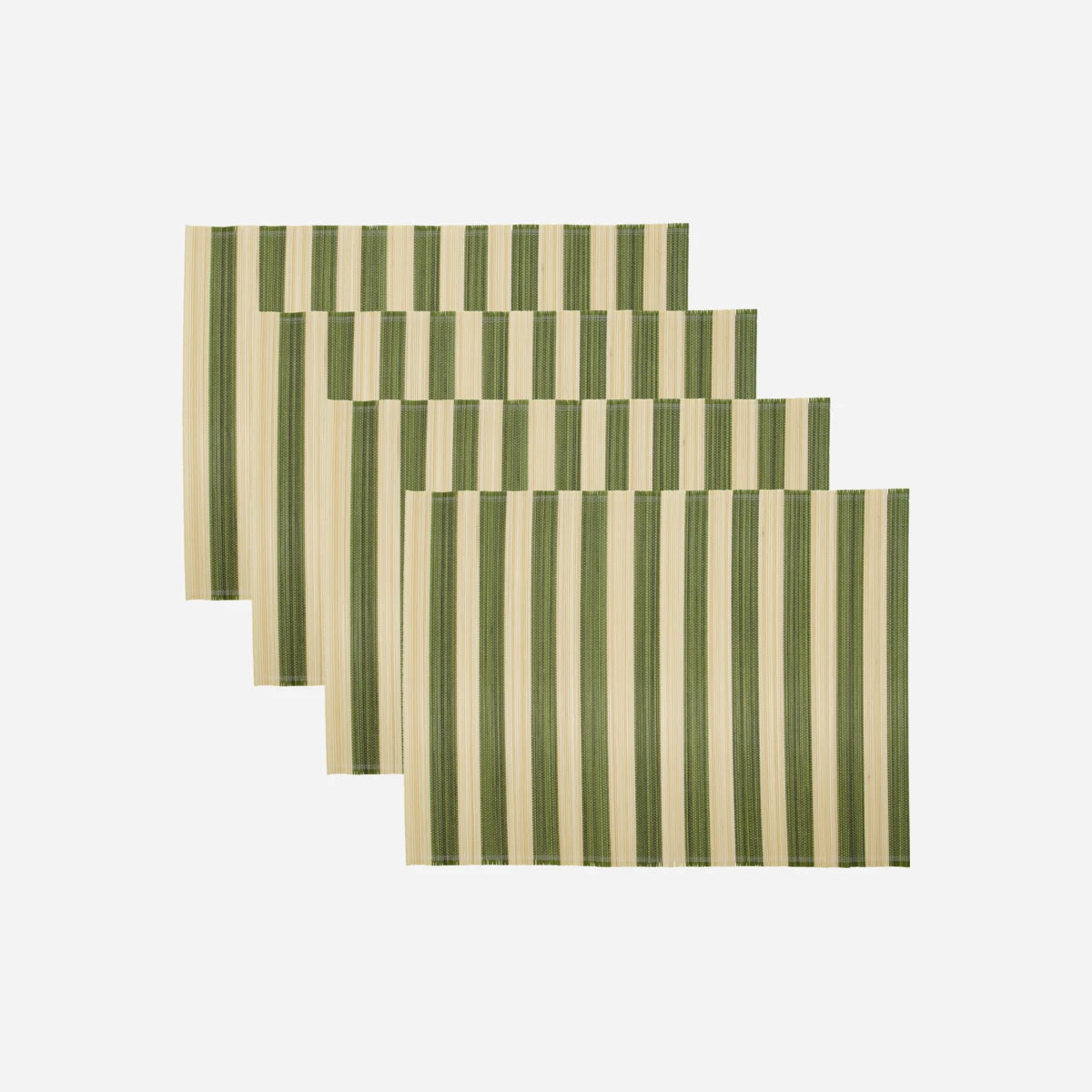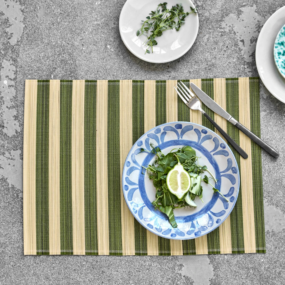 Tilfør din spiseplads med naturlig charme ved hjælp af disse håndlavede bordmåtter. De er lavet af en blanding af bambus og bomuld og har tidløse striber i grønt og råhvidt. Dette sæt med fire måtter giver et perfekt strejf af farve og elegance til dine borddækninger, hvilket gør hvert måltid til en stilfuld affære. - Håndlavet bambus og bomuld - Klassiske grønne og råhvide striber - Sæt med 4 måtter - Forbedrer bordæstetikken Tilføj en levende accent til dit spisebord .