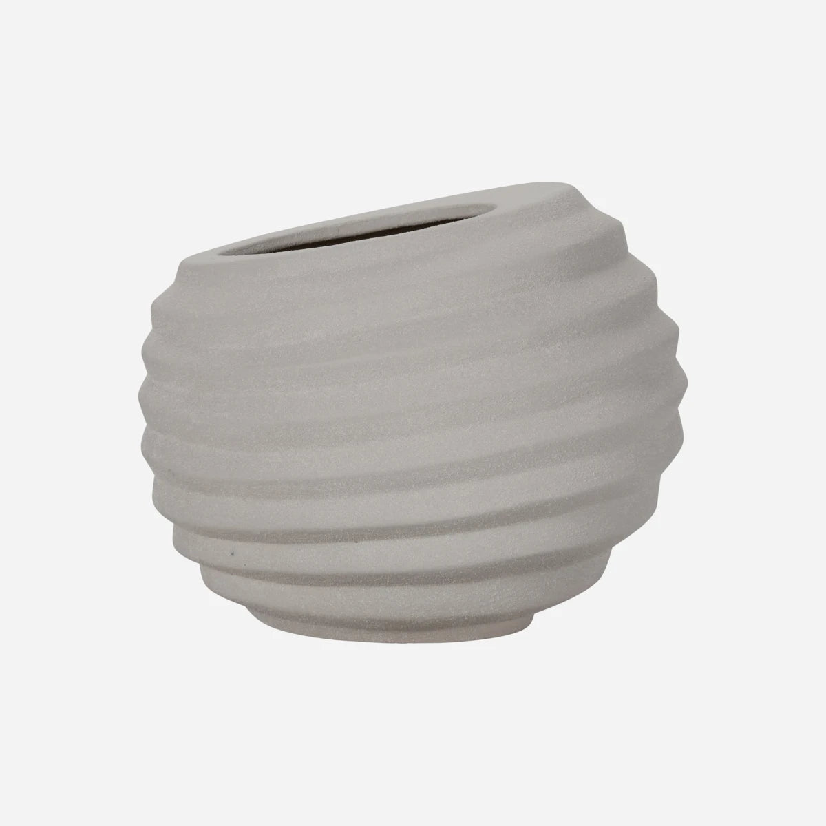 Gør din indretning endnu flottere med lidt asymmetri. Denne potteskjuler fra House Doctor har en rillet overflade, der skaber tekstur, og åbningen er ikke helt i midten. Sæt en flot, grøn plante i potteskjuleren, og stil den på endebordet, på et sidebord eller på en hylde for at tilføje en diskret detalje og et naturligt look til din indretning. Denne håndlavede potteskjuler har et rustikt look og er porøs. Derfor kan vi ikke garantere, at den er helt vandtæt. For at undgå skader på dine overflader skal du placere en underkop eller en lille måtte under potteskjuleren, eller du skal fore den.