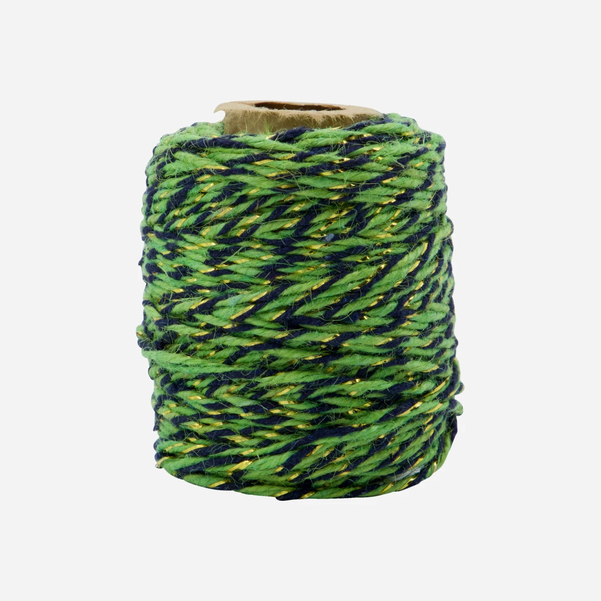 Det grønne bånd med twistet kvalitet giver dit gavebord et sofistikeret spil af jute, bomuld og gyldne lurextråde.