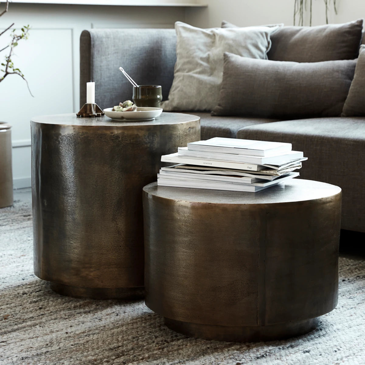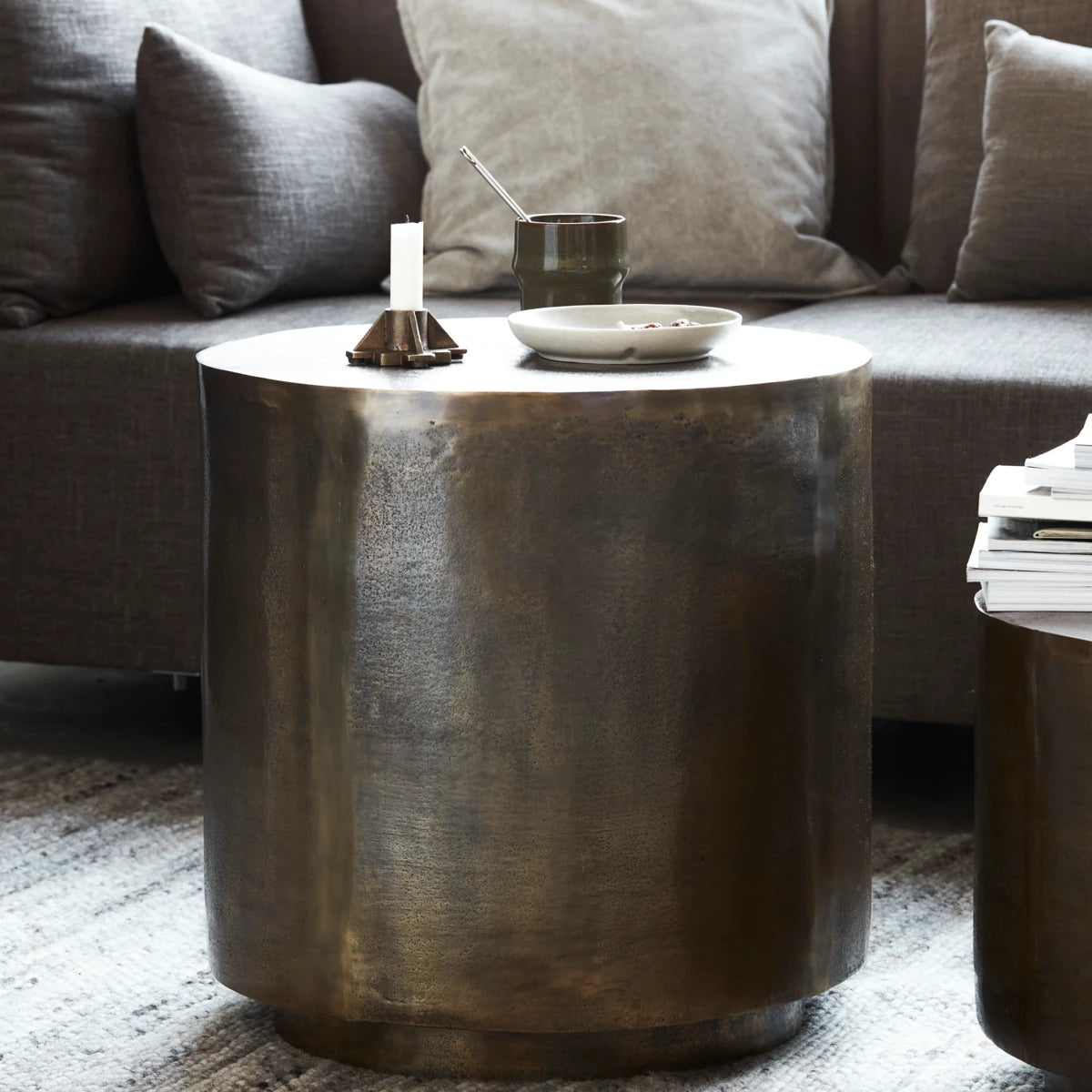 Intet slår metal i gyldne nuancer, når du gerne vil tilføje et strejf af elegance til dit hjem. Det er bestemt tilfældet med dette sofabord ved navn Rota, designet af House Doctor. Bordet er lavet af aluminium med en gylden messingfarve i finishen, der tilføjer lys og varme til din sofagruppe, når sollyset rammer det. Takket være overfladen med dens bevidste og velovervejede skønhedsfejl får du et bord med karakter. Sæt et tæppe nedenunder for at indramme bordet og dekorér det med din yndlingsvase for at give et personligt præg. Fås også i en mindre version. Vi anbefaler at bruge drikkebrikker for at beskytte overfladen.