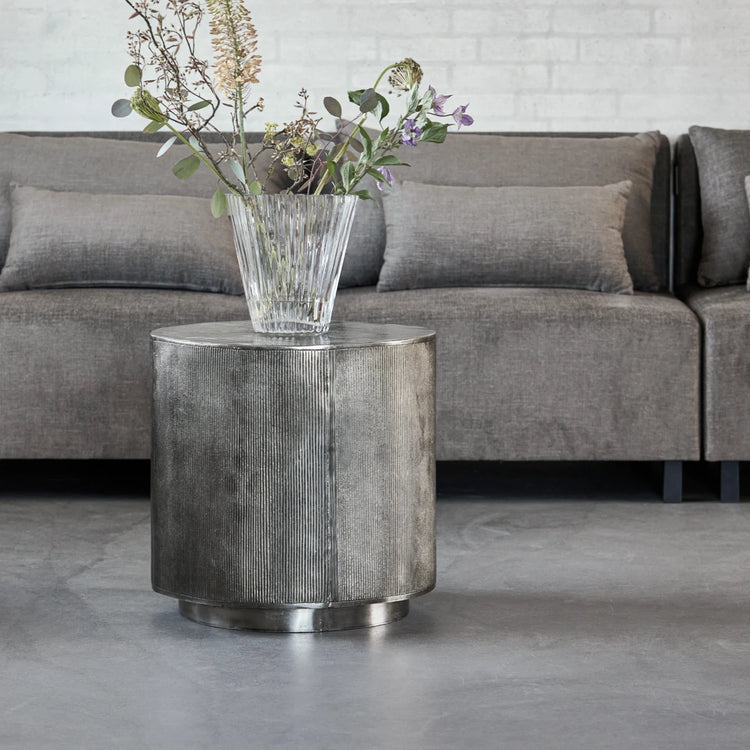 Rota er et rundt, sølvfarvet sofabord fra House Doctor. Med de lodrette riller og den irregulære overflade med bevidste ufuldkommenheder får du et bord, der kan se beskedent ud, men afslører karakter og charme. Læg et tæppe under for at indramme bordet, og dekorer det med din yndlingsvase for et personligt præg. Intet slår en sølvskinnende nuance, når du går efter en elegant stue. Rota-bordet har en tidløs appel - også selvom din boligstil ændrer sig over tid. Fås også i en mindre udgave og andre farver. Vi anbefaler at bruge glasbrikker for at beskytte overfladen.