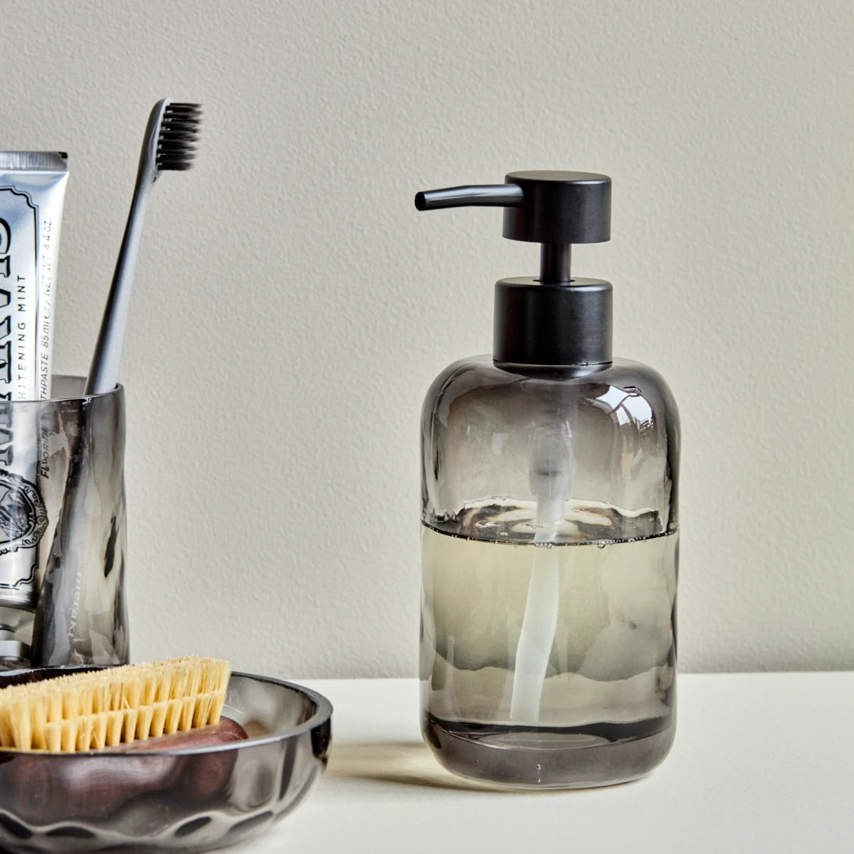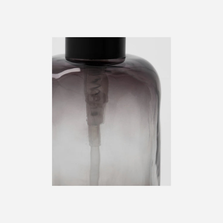 HDWah-sæbedispenseren er lavet i gråt glas med en fin, kruset overflade. Det stilrene design og pumpen i sort metal skaber en perfekt balance mellem funktion og æstetik.
