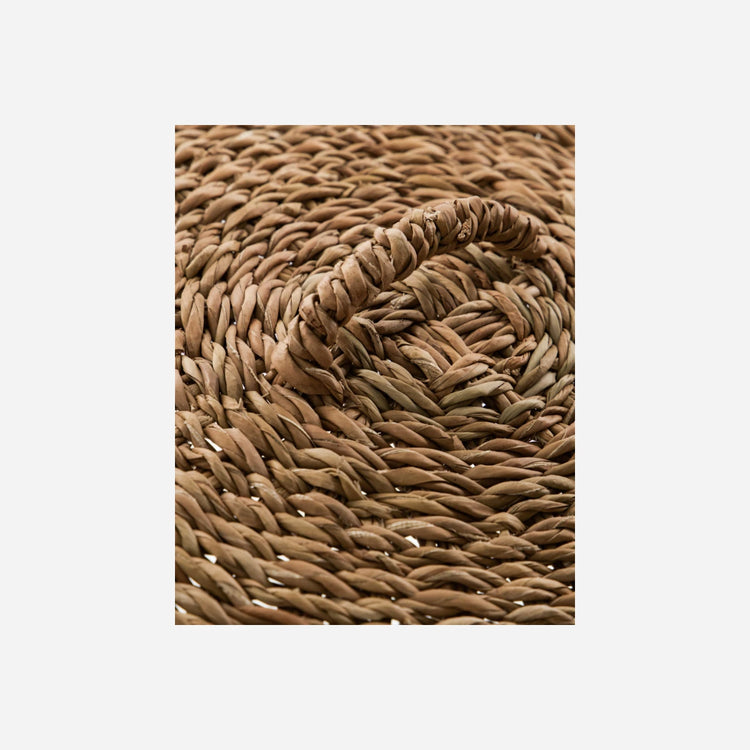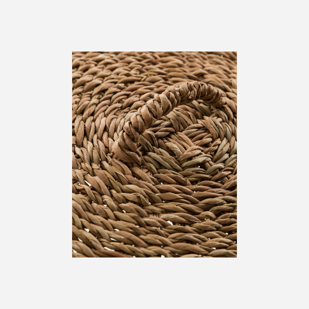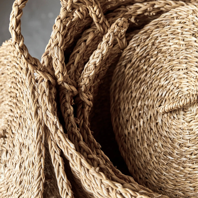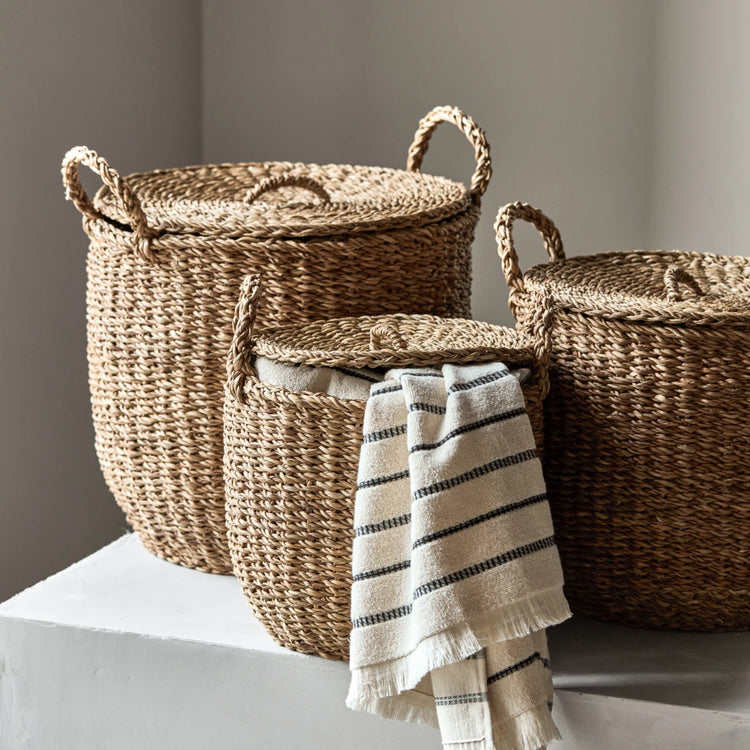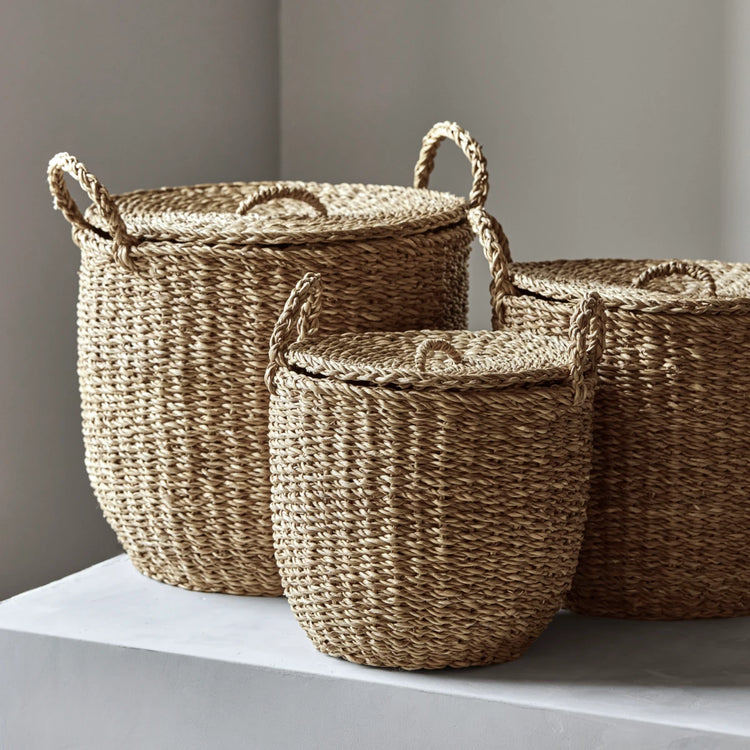 Opbevaringskurve i flettet søgræs giver varme og ro i din indretning.