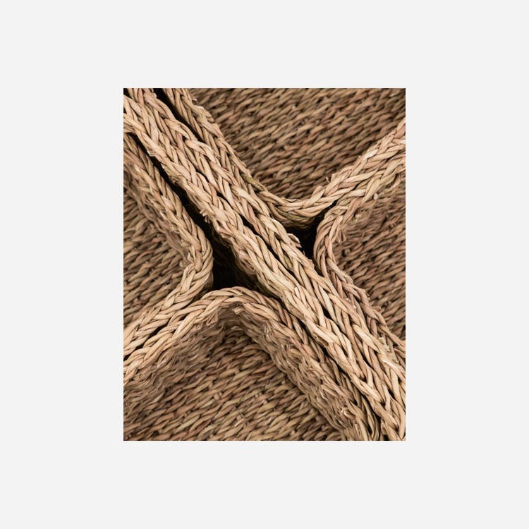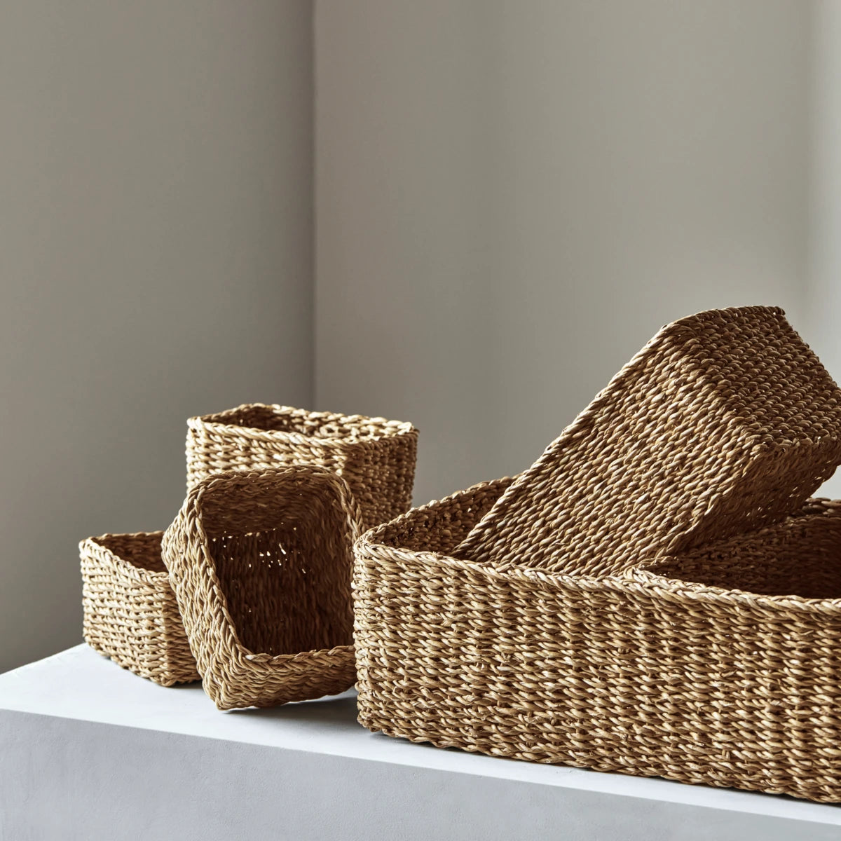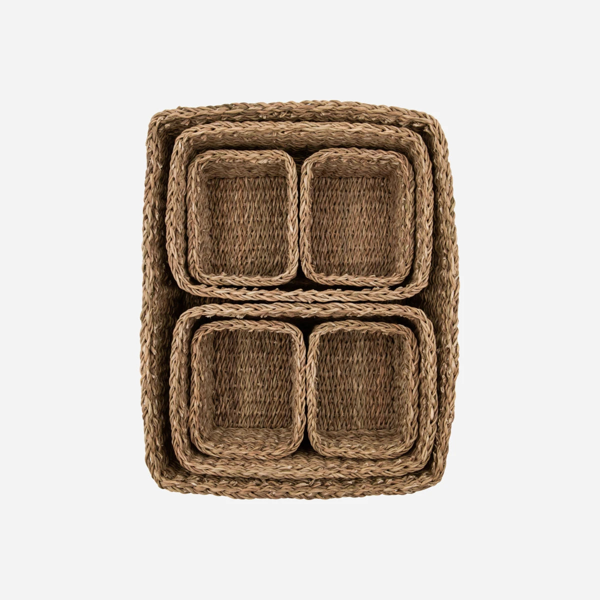 Opbevar alt fra accessories til småting med dette elegante sæt á 7 firkantede kurve i flettet søgræs. Den naturlige farve giver et roligt, tekstureret udtryk på badeværelset, i garderoben eller i køkkenet. Brug dem i skuffer eller som dekorative små opbevaringsløsninger på hylder og skabe for en enkel og organiseret hverdag.