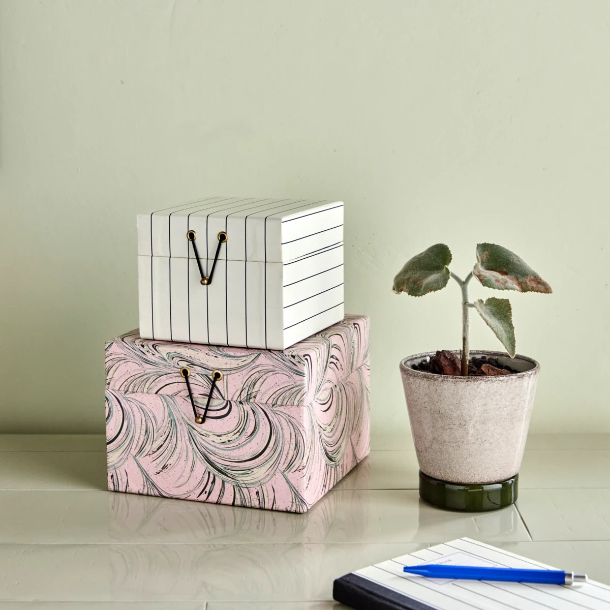 Sæt af to opbevaringskasser i sand og en afdæmpet rosa. Perfekt til at organisere kontorartikler, dokumenter og småting.