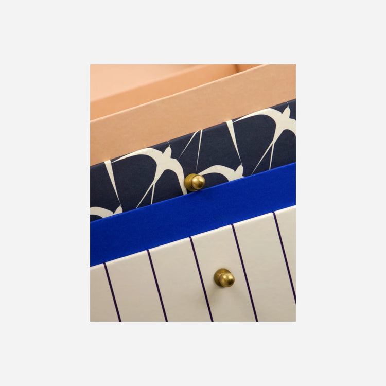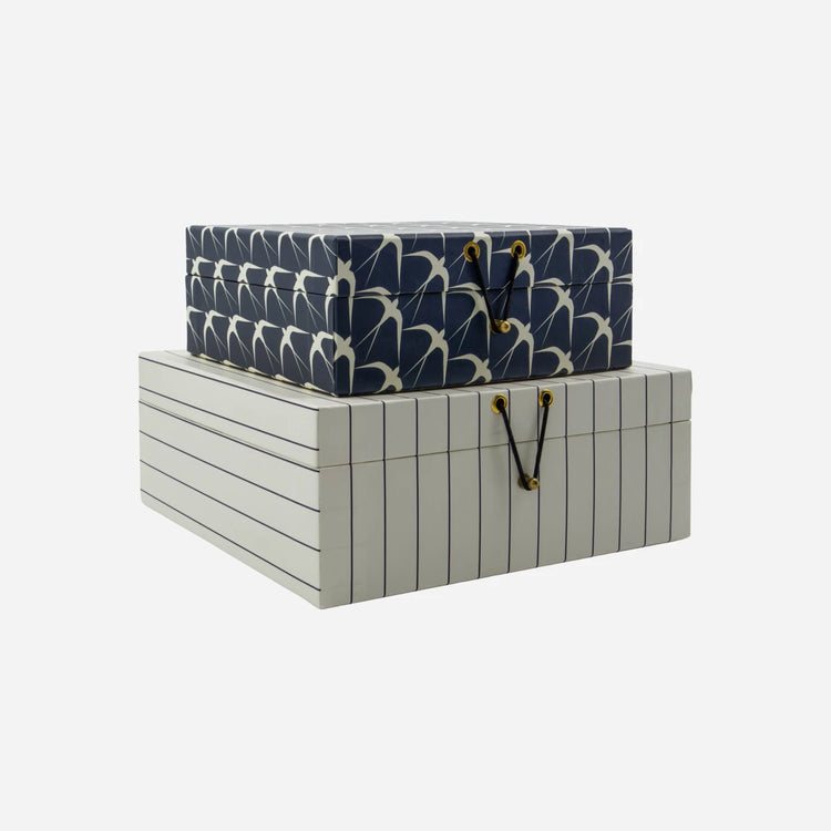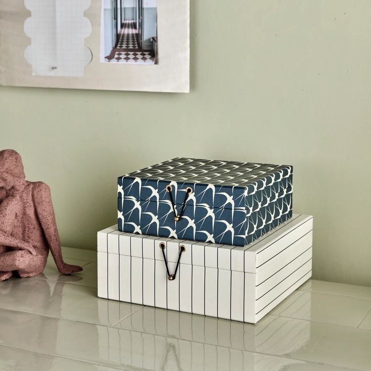Et sæt med to opbevaringsæsker i mørkegråt print og sandfarvede striber. Perfekt til at organisere kontorartikler, dokumenter og småting.