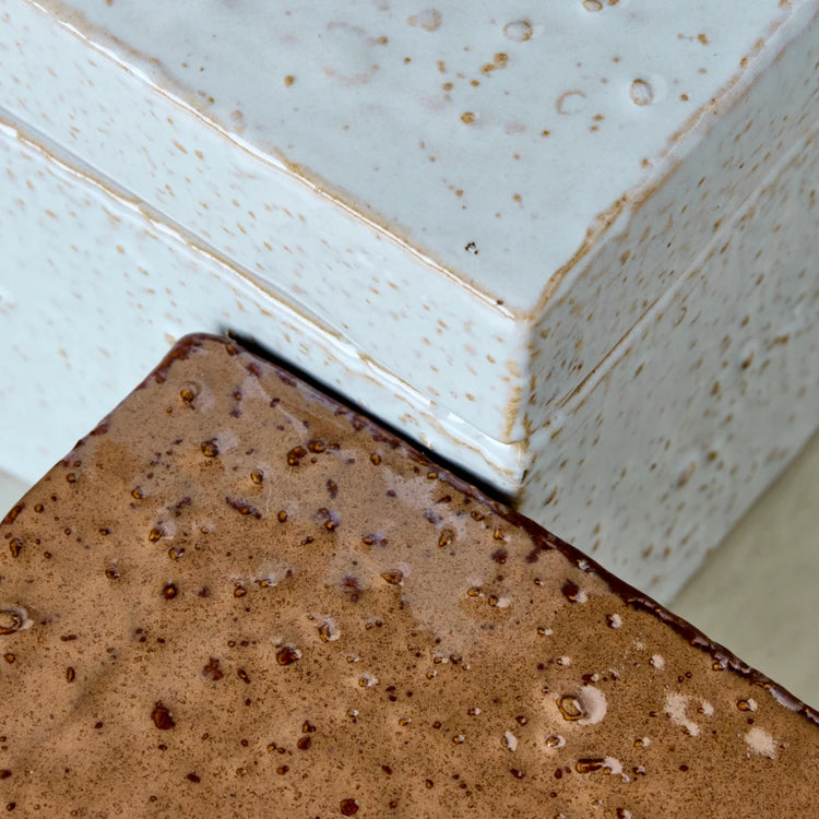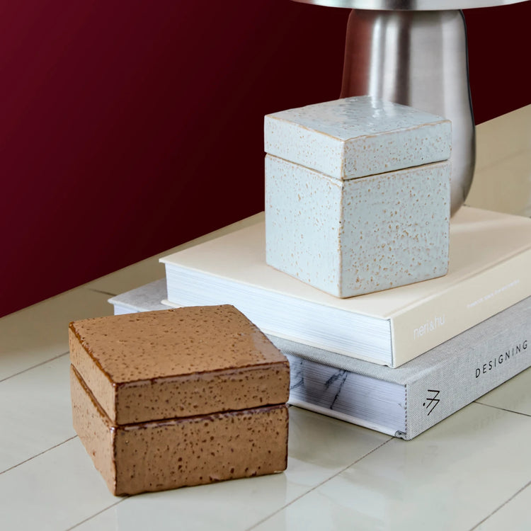Giv din indretning farve og personlighed med dette sæt håndlavede opbevaringskasser i keramik. De to kasser i brun og lyseblå gør det let at organisere hverdagens småting – på badeværelset, i stuen eller ved sengen. Hver kasse er unik, og den glaserede overflade fremhæver det autentiske udtryk, som skaber både stemning og funktion.