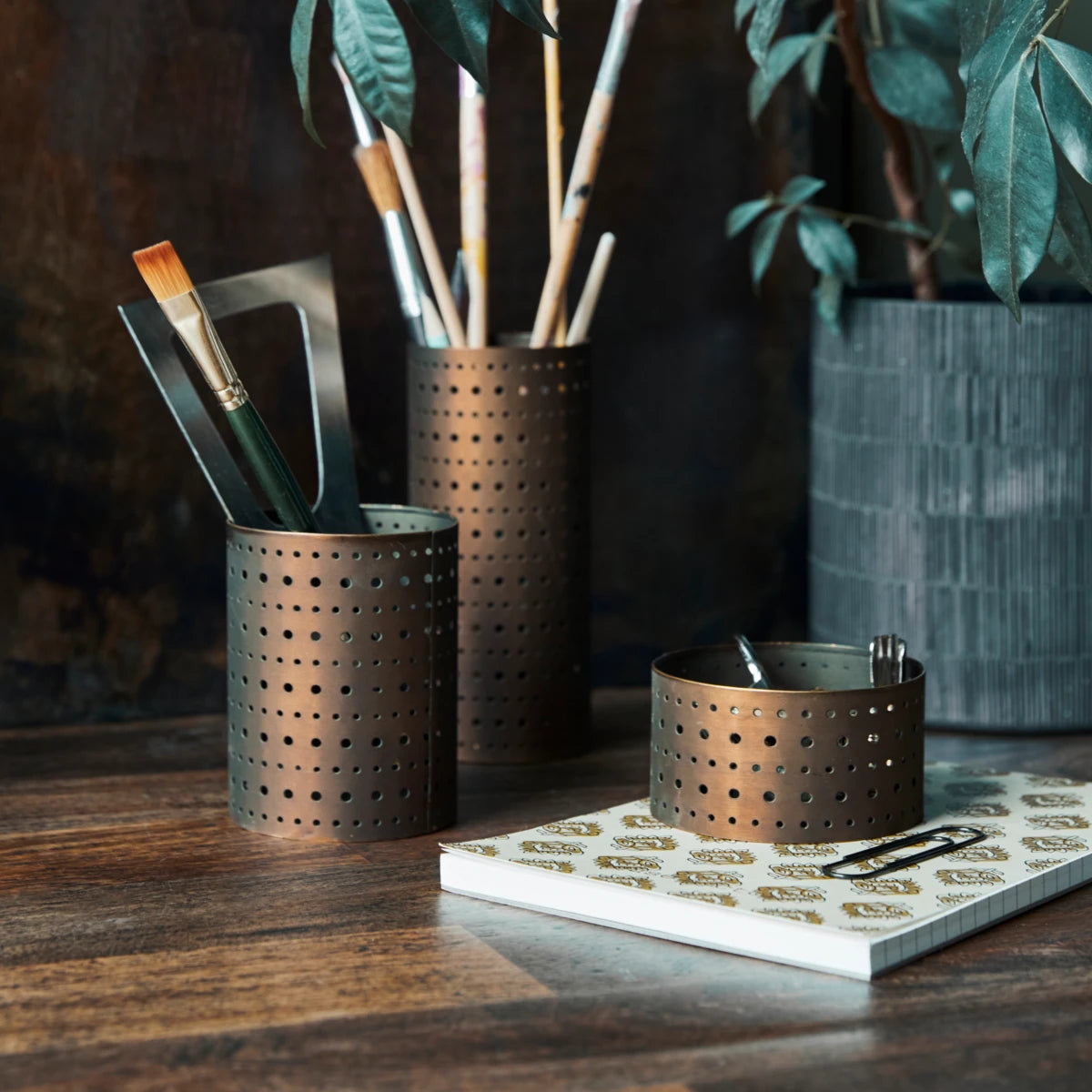 Gør dit skrivebord lidt flottere og mere ryddeligt med dette sæt med tre holdere fra House Doctor. Brug disse holdere med messingoverflade og et fint mønster til kuglepenne og blyanter, sakse og pensler, og få styr på dine kontorartikler på en stilfuld måde. Hvis du gerne vil pynte lidt op, kan du også bruge holderne til fyrfadslys eller som pynteting.