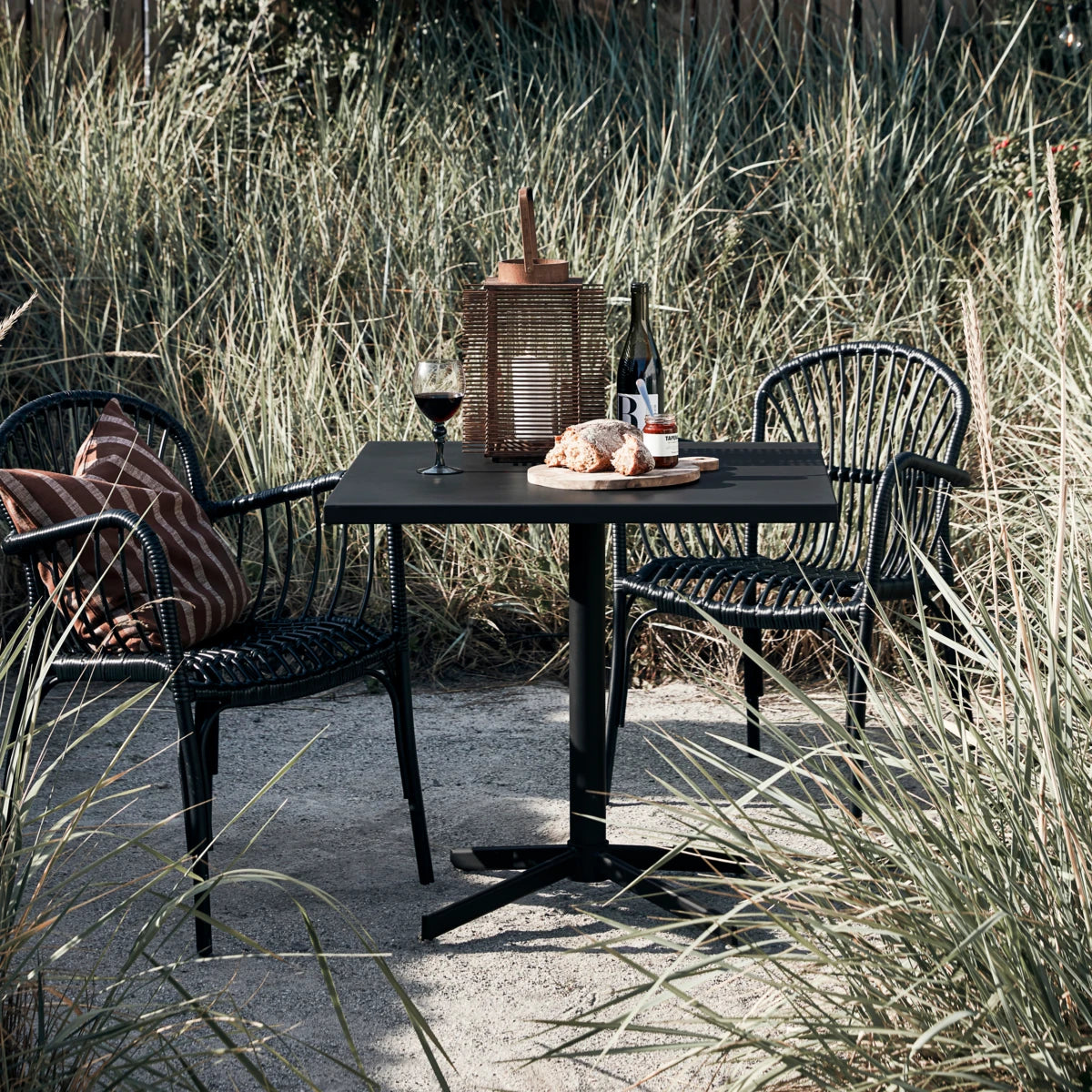 Brug det firkantede Helo bord fra House Doctor til at skabe en uformel hyggekrog. Bordet kan bruges både i stuen og udendørs, og det giver dig et perfekt sted til afslapning. Jernbordet har fået en mat, sort pulverlakering for at skabe et tidløst look, som passer ind i enhver boligindretning. Hvis du ønsker at spare plads, kan du blot vippe bordpladen op, når det ikke er i brug. Komplementer bordet med stole i flotte farver, og pynt med en vase og lysestager for et personligt udtryk. For at forlænge levetiden anbefaler vi at flytte Helo bordet indenfor, når det regner og er koldt.