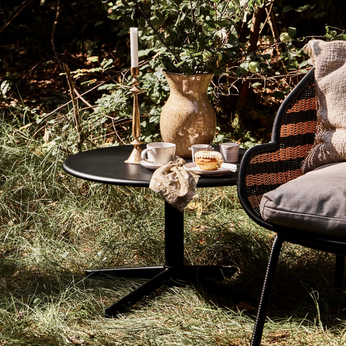 Skab et indbydende udendørs miljø med dette runde, sorte sofabord. Dets slanke jernkonstruktion med en matsort pulverlakering sikrer stil og holdbarhed. Det tidløse design er perfekt til enhver balkon eller terrasse og passer perfekt ind i forskellige indretningsstile. Bordets praktiske vipbare bordplade gør, at du nemt kan flytte det til forskellige steder, hvilket sikrer fleksibilitet til din udendørs nydelse.- Tidløst design i sort jern- Fleksibel, vipbar bordplade- Ideel til altaner og terrasser- Nem montering påkrævetTilføj dette alsidige bord til dit uderum for at få et stilfuldt og funktionelt touch.