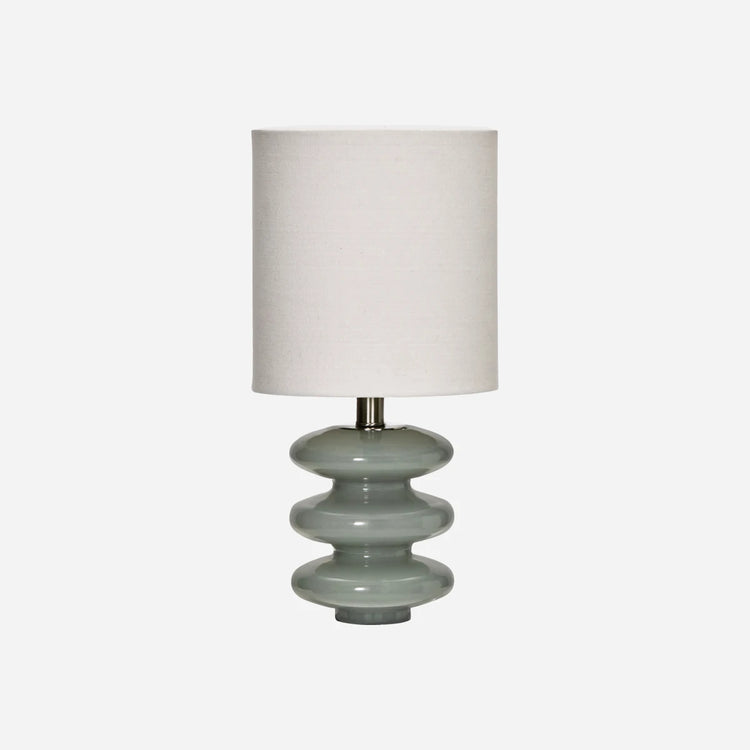 Skulpturel bordlampe med lyseblå glasfod og klassisk råhvid bomuldsskærm løfter stemningen i din stue, i dit soveværelse eller på hjemmekontoret. Lampen er håndlavet og spreder et indbydende, hyggeligt lys.