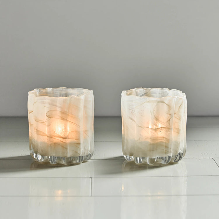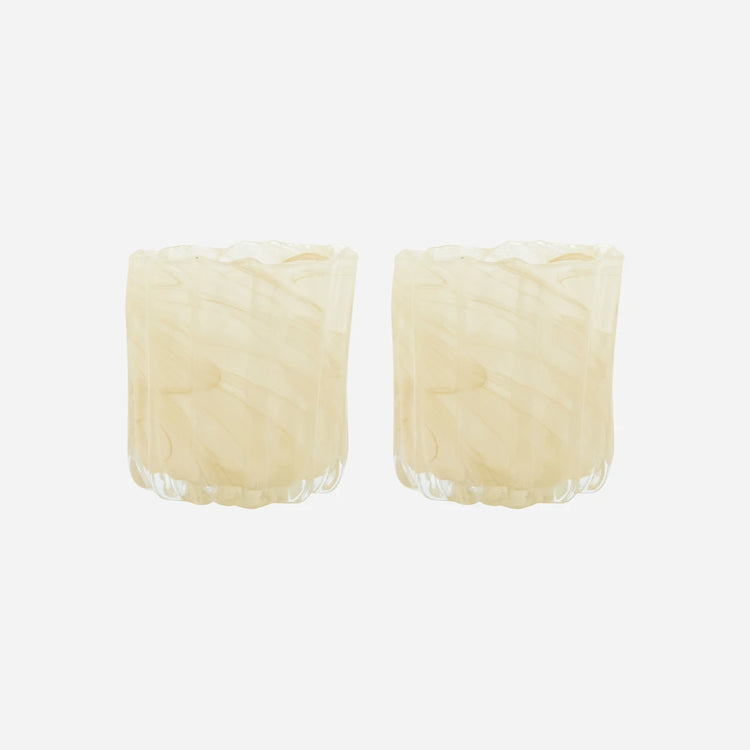 Et sæt med to fyrfadsstager i håndlavet glas med et riflet og organisk design. Det tykke glas, det diskrete hvirvel-mønster og den beige farve spreder tilsammen lyset på fineste vis.