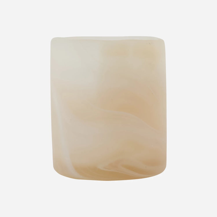 Skab en stemningsfuld atmosfære med disse to fyrfadsstager i mundblæst glas. Det elegante beige marmorerede mønster skaber et levende udtryk, mens det enkle design giver et strejf af elegance til stue, spiseplads eller badeværelse. Lad lyset spille i glasset, og bring varme ind i din indretning.